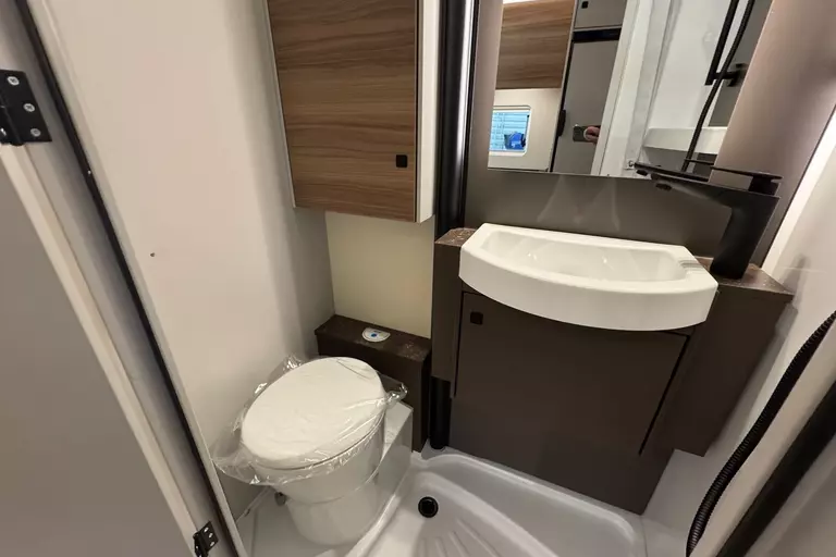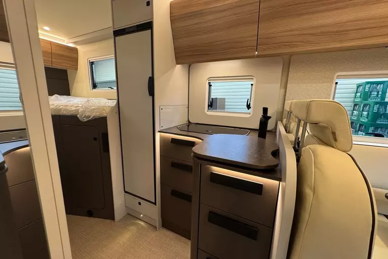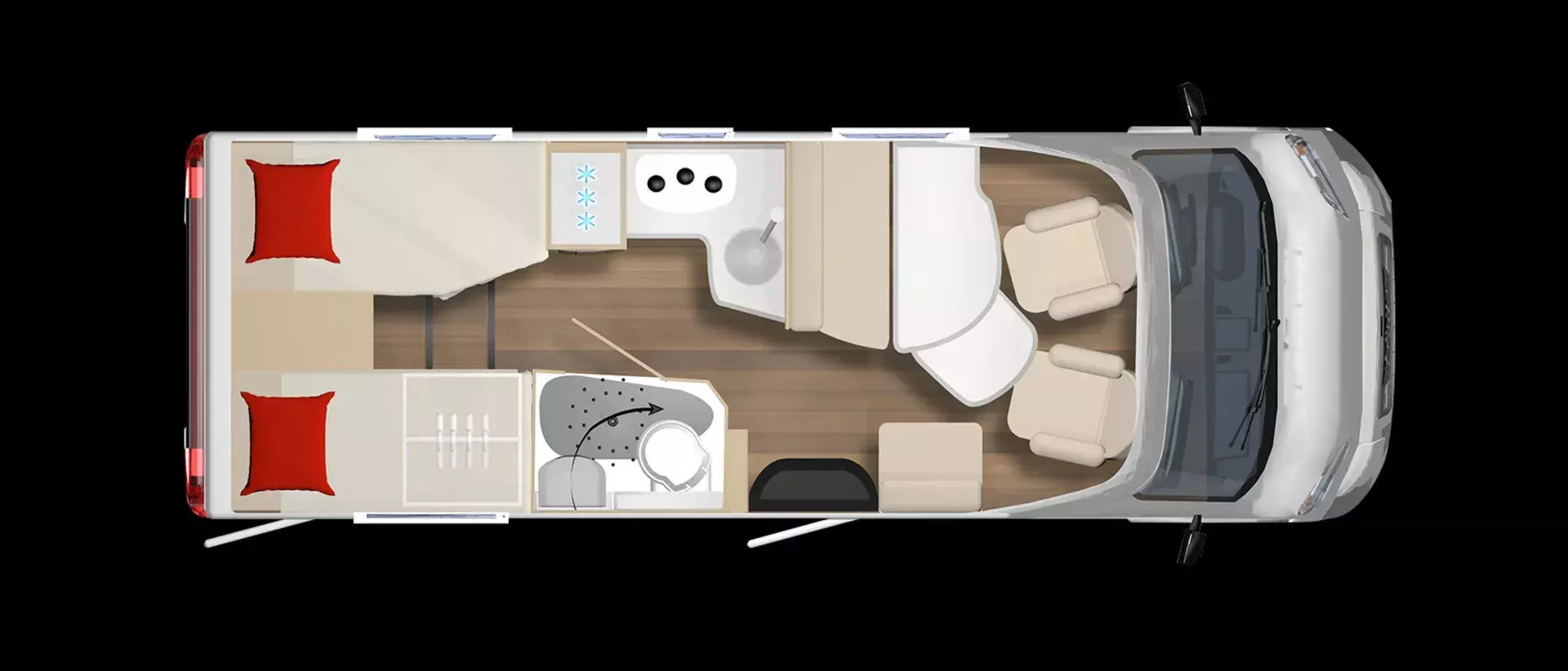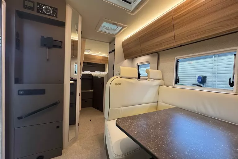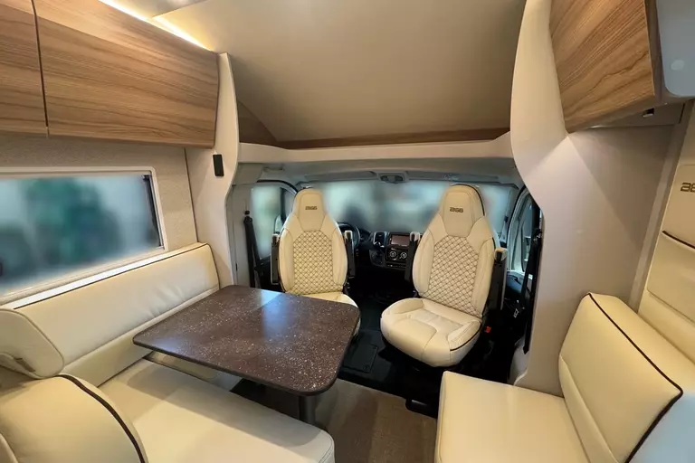 - L-shaped seating area including single-pedestal table base, tabletop adjustable in all directions