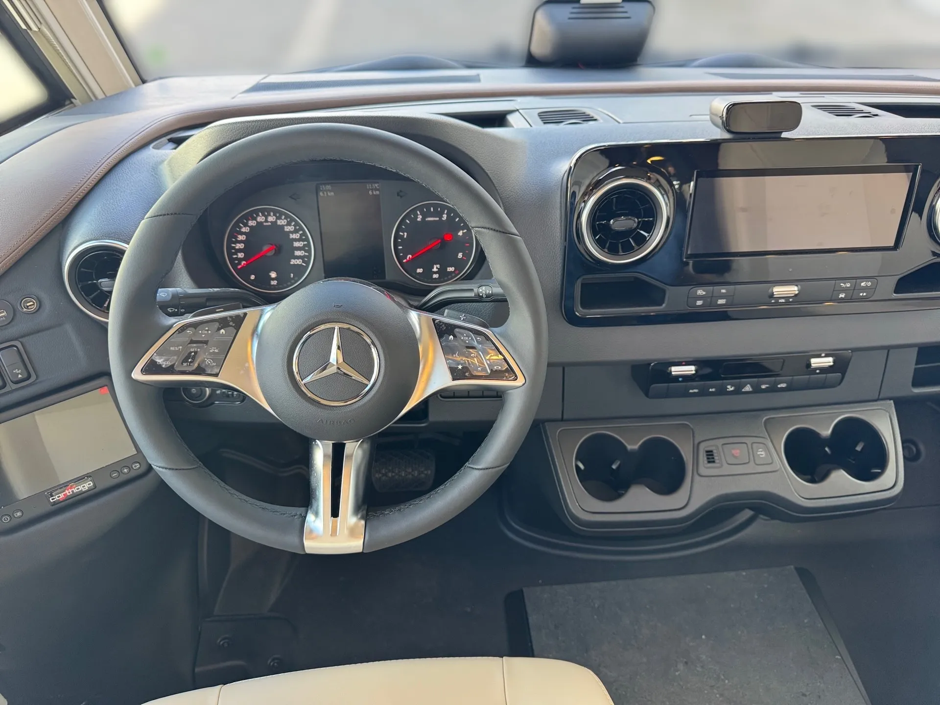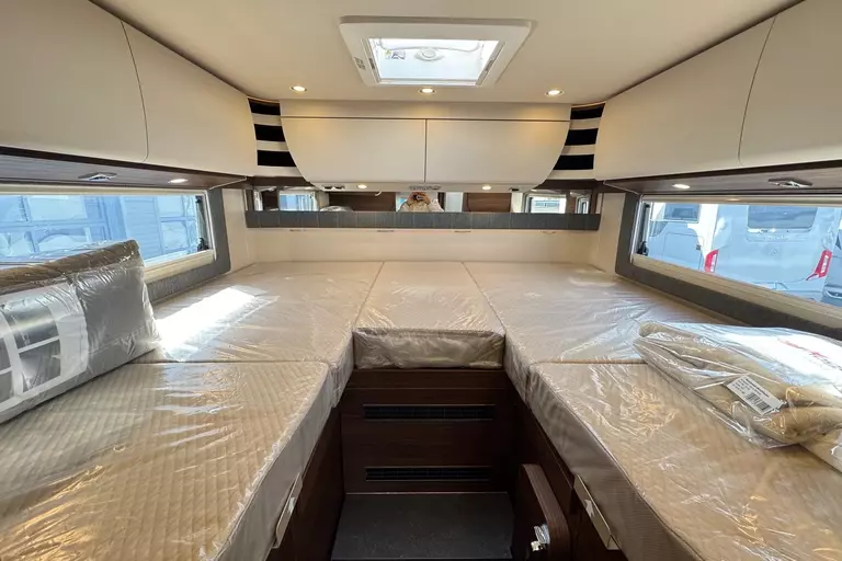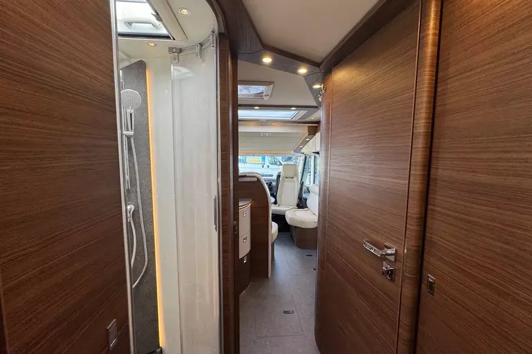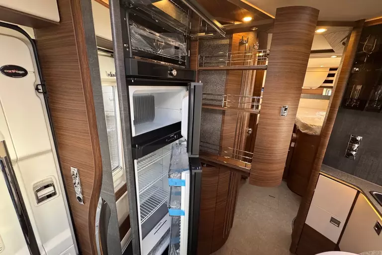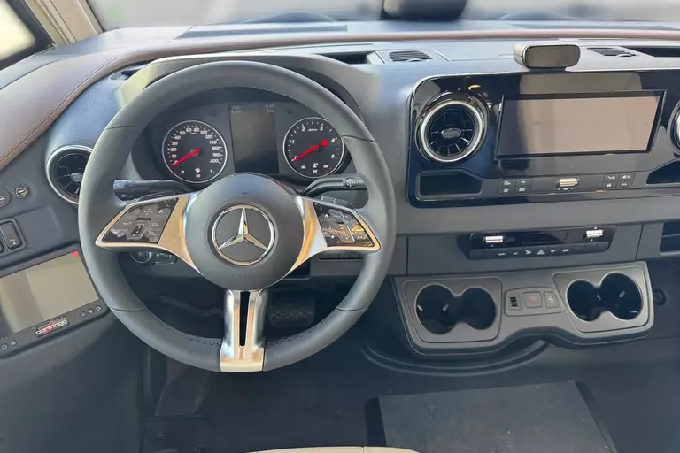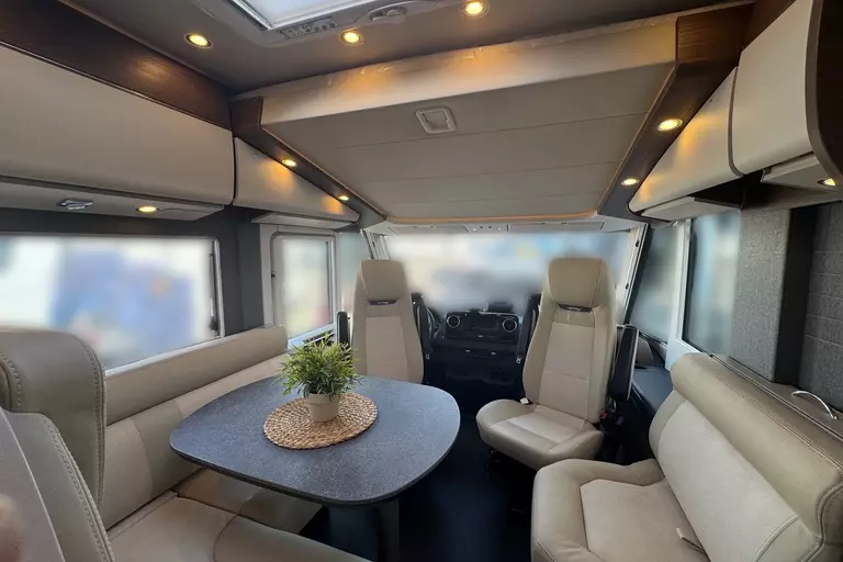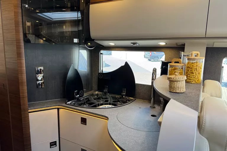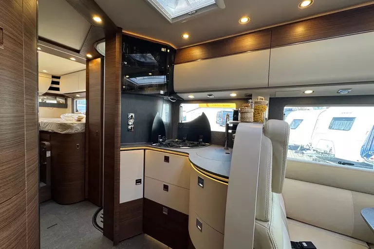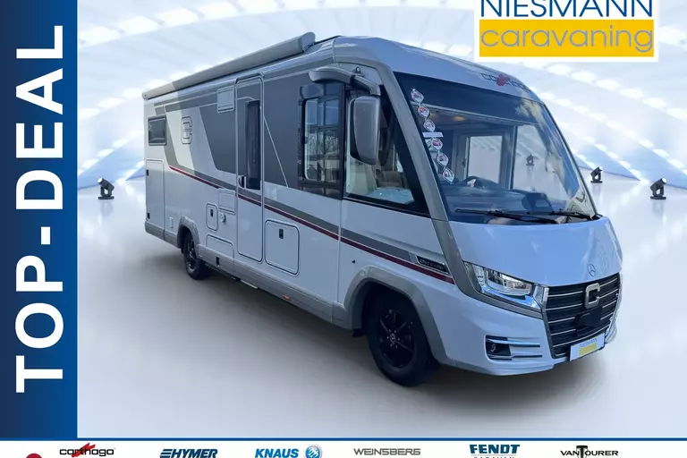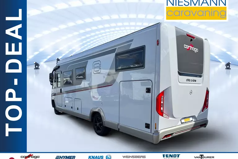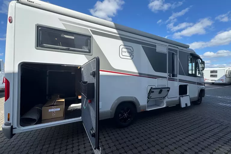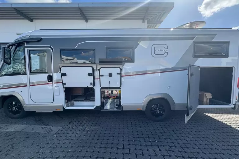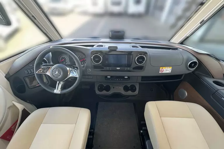 Special equipment: -Chassis Plus Package Mercedes consisting of: •Engine variant 170 hp / 125 kW, Euro VI E •Fully automatic air conditioning system THERMOTRONIC •16-inch Mercedes alloy wheels (black) with all-season tires -Driver Assistance Package Mercedes-Benz consisting of: •Active Lane Keeping Assist •Tire Pressure Monitoring System •Active Distance Assist DISTRONIC -Super Package Single-Axle consisting of: •Preparation for satellite system •USB socket in the overhead storage cabinet above the rear bed •Scooter garage upgrade with needle felt, luggage nets •SOG toilet ventilation via roof chimney •92-liter fuel tank •Preparation for rear view camera (single lens) •Electric parking brake •Traffic Sign Assist (MERCEDES) •Instrument cluster with color display •Cab seats with tilt and height adjustment (front/rear) •Central locking for cab doors and body door, remote control with "coming home" function •Rain sensor •Carthago best view bus mirror with black/white bus mirror housing, electrically adjustable and heated •Steering wheel with height and tilt adjustment •Solar system preparation •Front axle with increased load capacity •XL "premium two 2.0" body door (width 63 cm) with double locking, window and insect screen •Radio preparation with roof antenna with DAB+, speakers (4x), DVB-T2 reception •Designer bar cabinet with glass holder and glass set above kitchen •Charging booster •Mercedes MBUX 10.2" multimedia system instead of radio/CD/DVD double DIN including navigation, DAB+, touchscreen •Truma DuoControl CS •Crank-operated rear supports for roll stabilization when stationary •Multifunction and leather-covered steering wheel with height and tilt adjustment •Rear view camera system with 7" color monitor on the side of the dashboard and camera lens integrated in the rear section -TV package for bedroom (LE beds) consisting of: • 24" Smart LED TV in bedroom, TV cabinet or washroom rear wall • TV cabinet in bedroom with TV pull-out system and connection set - 32" Living room TV package consisting of: • 32" Smart LED TV for TV pull-out system • 32" TV pull-out system in side seat bench - "Kitchen / Coffee" package with capsule coffee machine instead of coffee machine consisting of: • Capsule coffee machine with connection set including pull-out system • Voltage converter 12 V to 230 V, 2,000 W with mains priority circuit - SURCHARGE for Teleco Flatsat Easy Skew Smart 90 satellite system / Twin LNB for second TV - Weight increase from 4,200 kg to 4,500 kg - Electrically retractable and extendable driver's cabin door entry step - Central locking for exterior and roller garage doors - Aluminum cassette roof awning, gray fabric Length: 5.5 m -Power pack with additional sockets (3 x 230 V, 2 x USB) -External gas connection behind raised floor exterior storage compartment on passenger side -Thetford C 260 toilet with ceramic insert -Tec-Tower 153 l refrigerator combination with separate freezer compartment and gas oven -Aluminum checker plate floor in scooter garage -Alde hot water heating, 230 V / gas operation with booster in driver's cab -Amalfi style suite -Pearl partial leather -Carpeting for living area -Carpeting for driver's cab area -Carthago sleeping area & decor set: decorative pillows, throw blanket, fitted sheet set -Freight to the trading center (Polch)