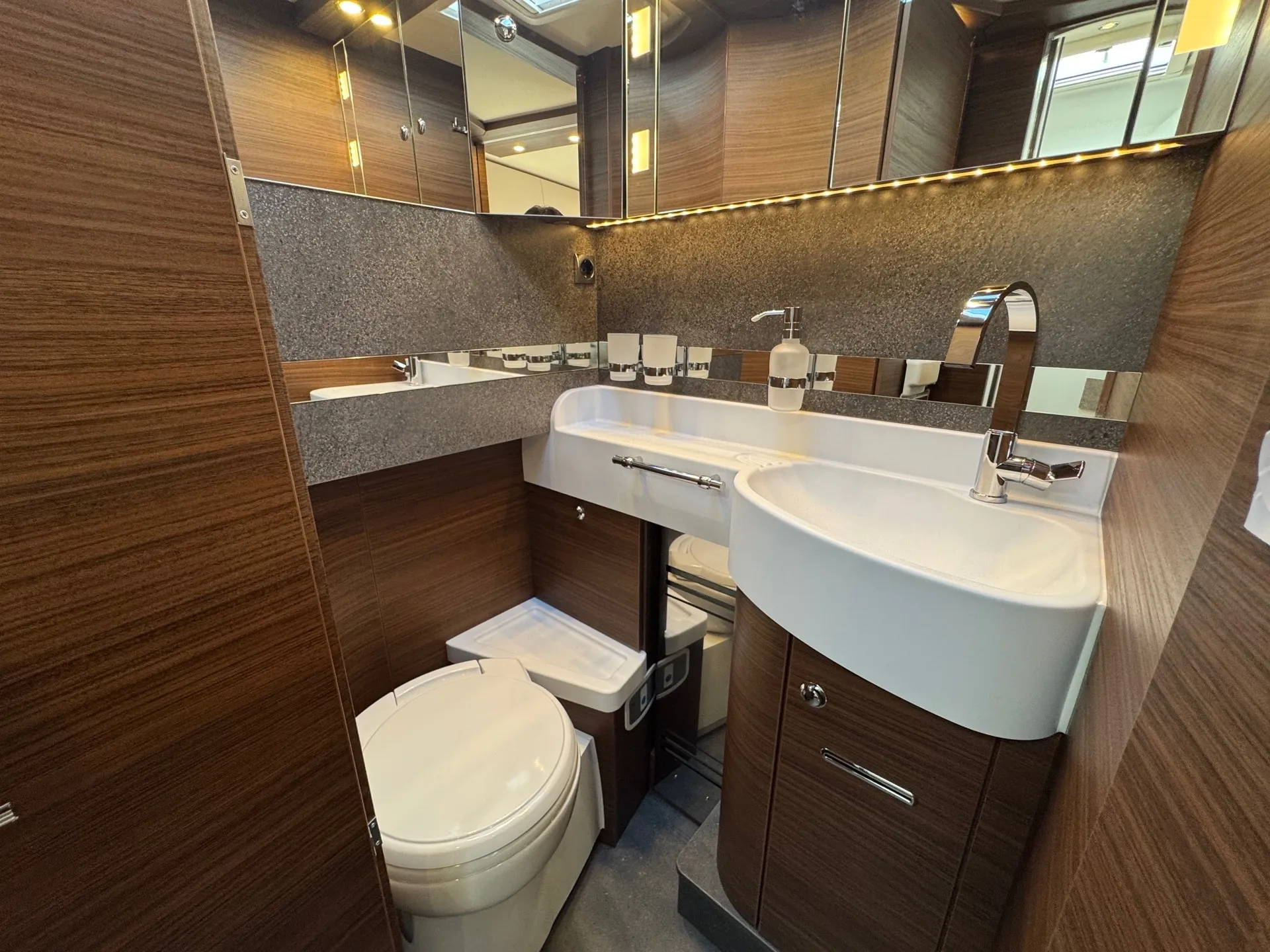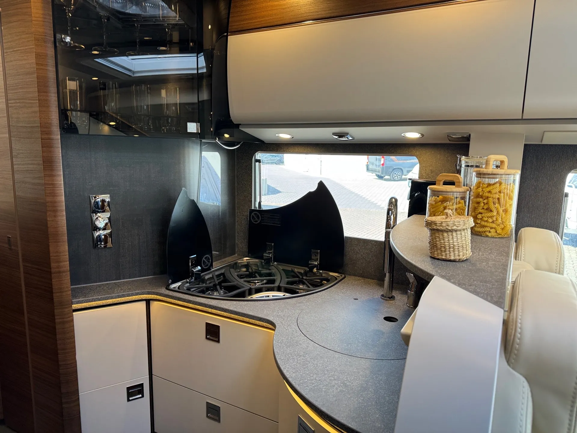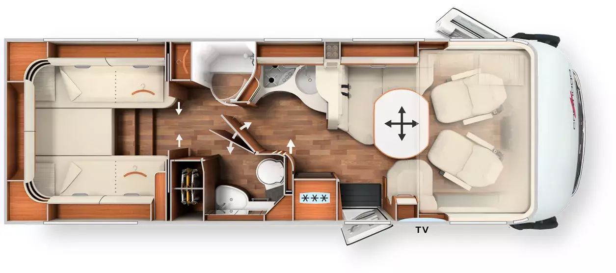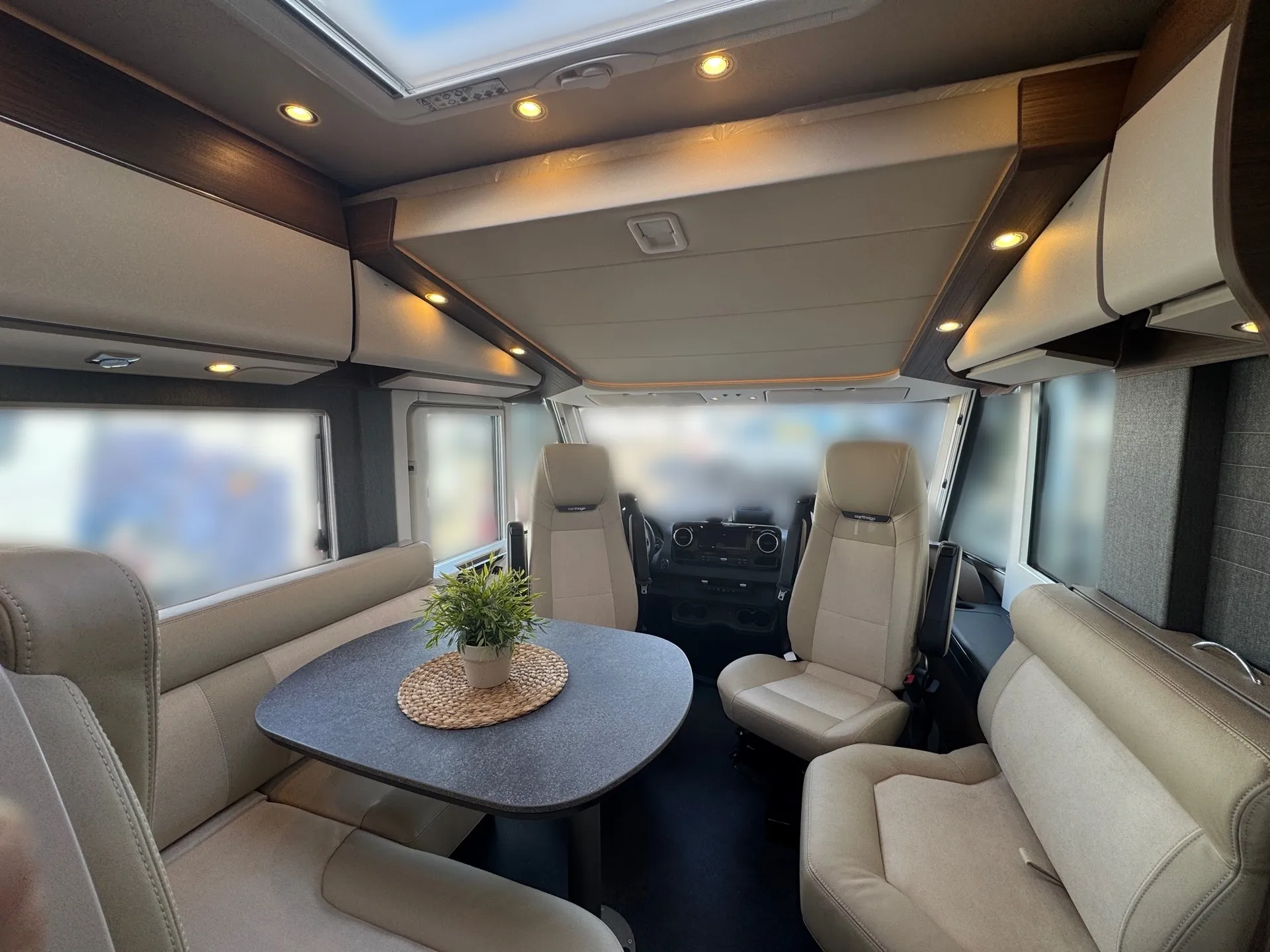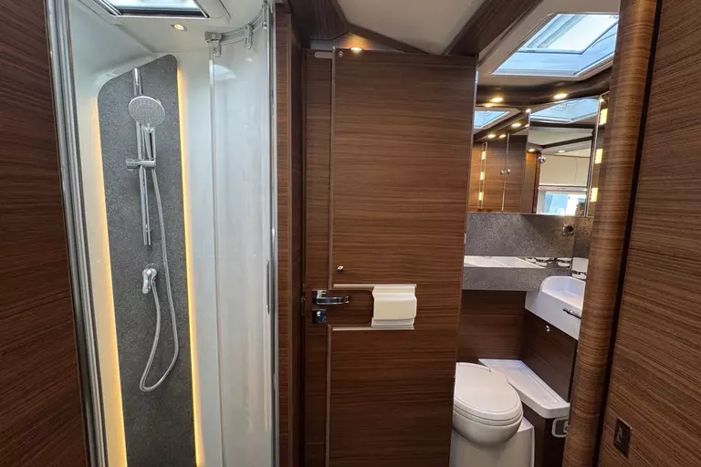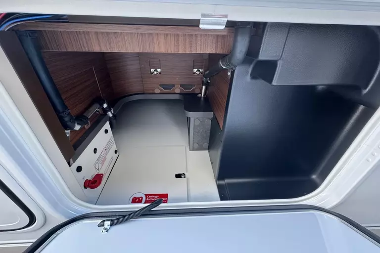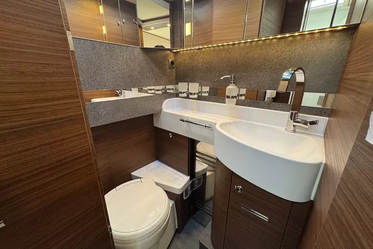 Special equipment: -Chassis Plus Package Mercedes consisting of: •Engine variant 170 hp / 125 kW, Euro VI E •Fully automatic air conditioning system THERMOTRONIC •16-inch Mercedes alloy wheels (black) with all-season tires -Driver Assistance Package Mercedes-Benz consisting of: •Active Lane Keeping Assist •Tire Pressure Monitoring System •Active Distance Assist DISTRONIC -Super Package Single-Axle consisting of: •Preparation for satellite system •USB socket in the overhead storage cabinet above the rear bed •Scooter garage upgrade with needle felt, luggage nets •SOG toilet ventilation via roof chimney •92-liter fuel tank •Preparation for rear view camera (single lens) •Electric parking brake •Traffic Sign Assist (MERCEDES) •Instrument cluster with color display •Cab seats with tilt and height adjustment (front/rear) •Central locking for cab doors and body door, remote control with "coming home" function •Rain sensor •Carthago best view bus mirror with black/white bus mirror housing, electrically adjustable and heated •Steering wheel with height and tilt adjustment •Solar system preparation •Front axle with increased load capacity •XL "premium two 2.0" body door (width 63 cm) with double locking, window and insect screen •Radio preparation with roof antenna with DAB+, speakers (4x), DVB-T2 reception •Designer bar cabinet with glass holder and glass set above kitchen •Charging booster •Mercedes MBUX 10.2" multimedia system instead of radio/CD/DVD double DIN including navigation, DAB+, touchscreen •Truma DuoControl CS •Crank-operated rear supports for roll stabilization when stationary •Multifunction and leather-covered steering wheel with height and tilt adjustment •Rear view camera system with 7" color monitor on the side of the dashboard and camera lens integrated in the rear section -TV package for bedroom (LE beds) consisting of: • 24" Smart LED TV in bedroom, TV cabinet or washroom rear wall • TV cabinet in bedroom with TV pull-out system and connection set - 32" Living room TV package consisting of: • 32" Smart LED TV for TV pull-out system • 32" TV pull-out system in side seat bench - "Kitchen / Coffee" package with capsule coffee machine instead of coffee machine consisting of: • Capsule coffee machine with connection set including pull-out system • Voltage converter 12 V to 230 V, 2,000 W with mains priority circuit - SURCHARGE for Teleco Flatsat Easy Skew Smart 90 satellite system / Twin LNB for second TV - Weight increase from 4,200 kg to 4,500 kg - Electrically retractable and extendable driver's cabin door entry step - Central locking for exterior and roller garage doors - Aluminum cassette roof awning, gray fabric Length: 5.5 m -Power pack with additional sockets (3 x 230 V, 2 x USB) -External gas connection behind raised floor exterior storage compartment on passenger side -Thetford C 260 toilet with ceramic insert -Tec-Tower 153 l refrigerator combination with separate freezer compartment and gas oven -Aluminum checker plate floor in scooter garage -Alde hot water heating, 230 V / gas operation with booster in driver's cab -Amalfi style suite -Pearl partial leather -Carpeting for living area -Carpeting for driver's cab area -Carthago sleeping area & decor set: decorative pillows, throw blanket, fitted sheet set -Freight to the trading center (Polch)