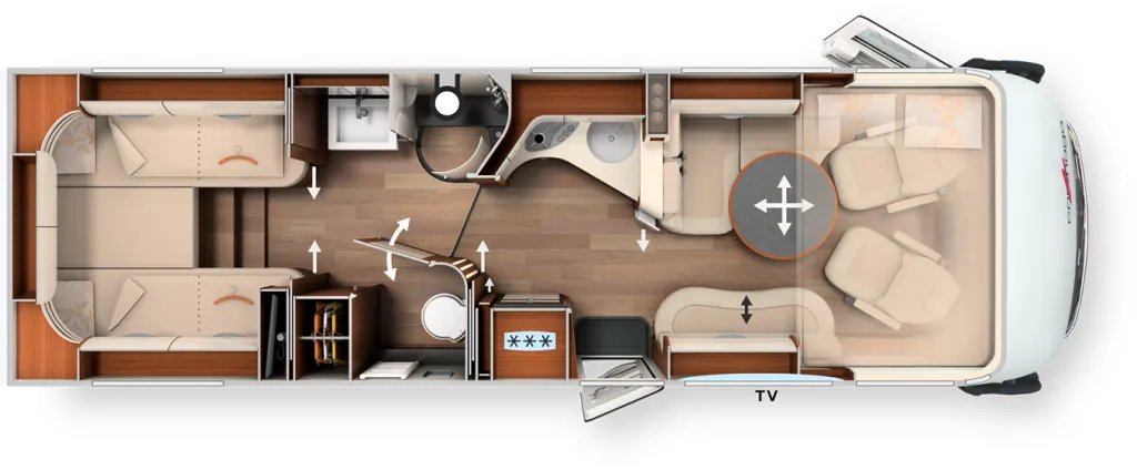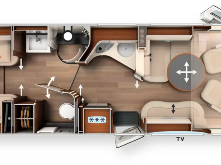 -Bedroom TV package for floor plans with LEB consisting of: •Carthago TV pull-out system for bedroom TV cabinet •24" Smart LED TV in bedroom, TV cabinet, or washroom rear wall