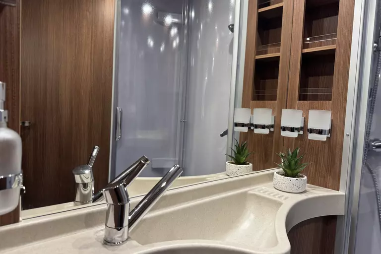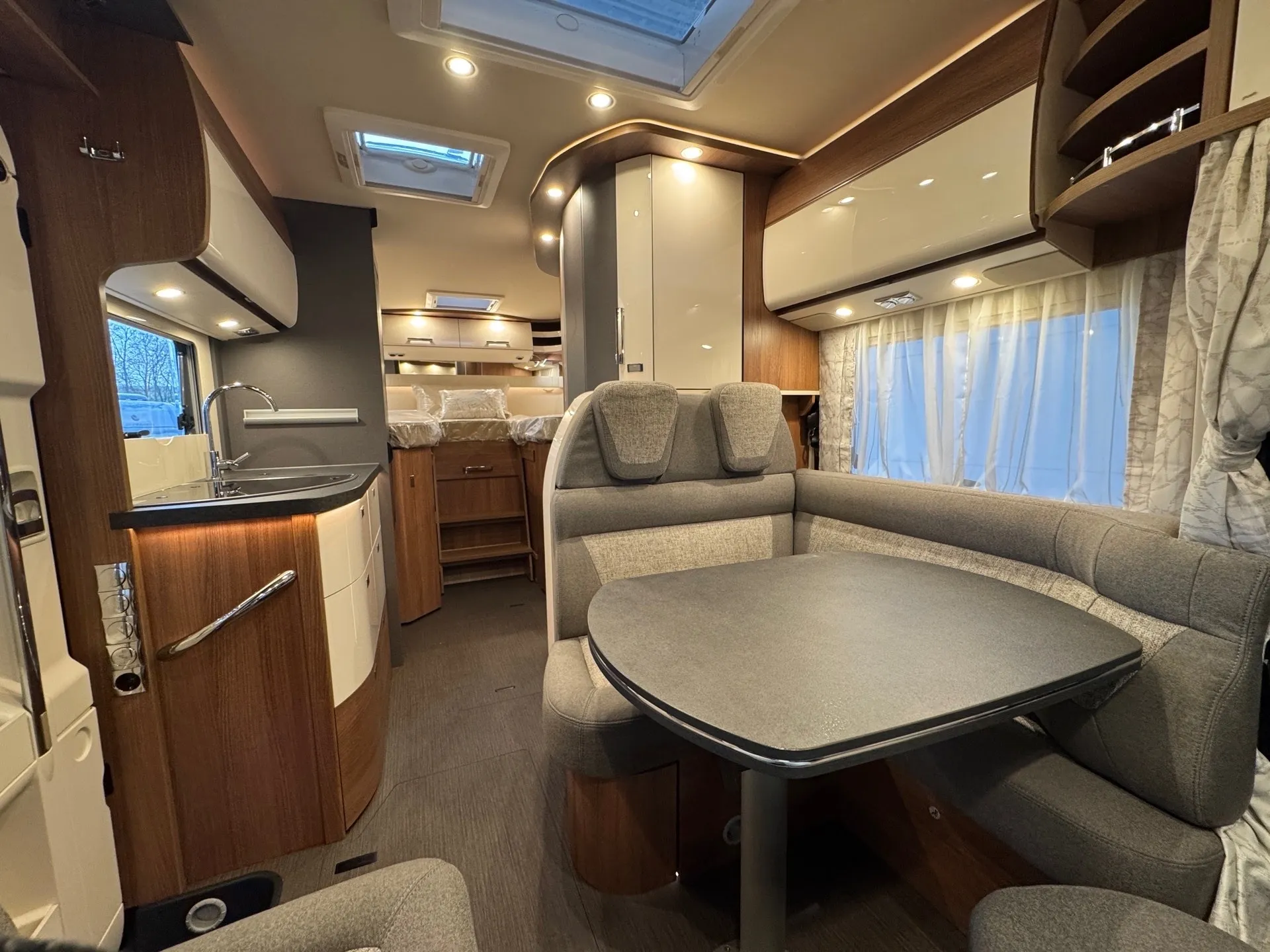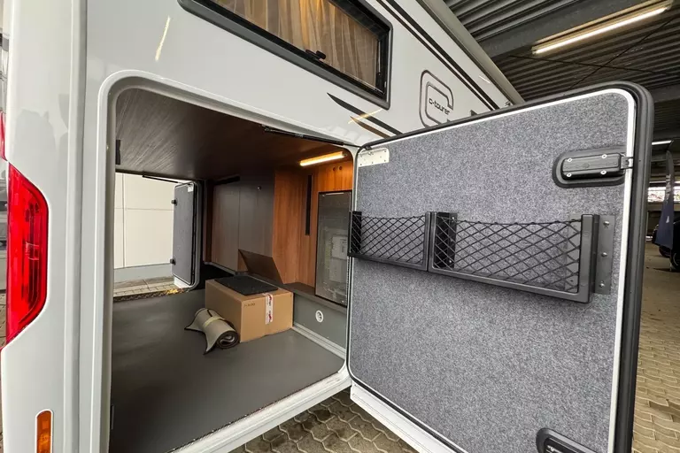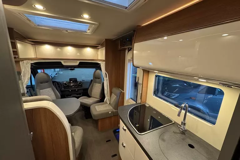- Basic Plus Package Mercedes comfort 4.2 t (Wheel trims, Tempmatik semi-automatic climate control, Cruise control, Charging booster, Front axle with increased load capacity, 92-liter fuel tank, Leather steering wheel with optional multifunction buttons (including leather gearshift lever with manual transmission), Instrument cluster with color display, Rain sensor, Electric parking brake, Heat-insulating glass with band filter on the windshield, Cab darkening system: pleated blinds on the front and side windows, Cab comfort seats with tilt and height adjustment (front/rear), Radio preparation with roof antenna with DAB+, Speakers (4x), MBUX 10.2" multimedia system including navigation and DAB+, traffic sign assistant, Midi-Heki roof hatch with LED spotlights above the L-shaped seating area, large scooter garage door on the driver's side, XL habitation door "premium two 2.0" (63 cm wide) with double locking mechanism, window and insect screen roller blinds, SOG toilet ventilation, wastewater hose set for convenient disposal, USB socket in the overhead storage compartment above the rear bed, preparation for electric roof vent, preparation for solar system, preparation for satellite system, preparation for reversing camera (single lens)