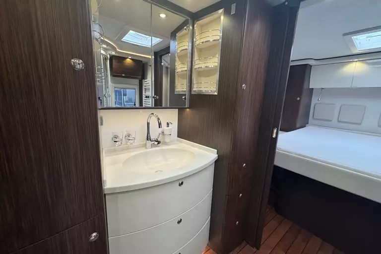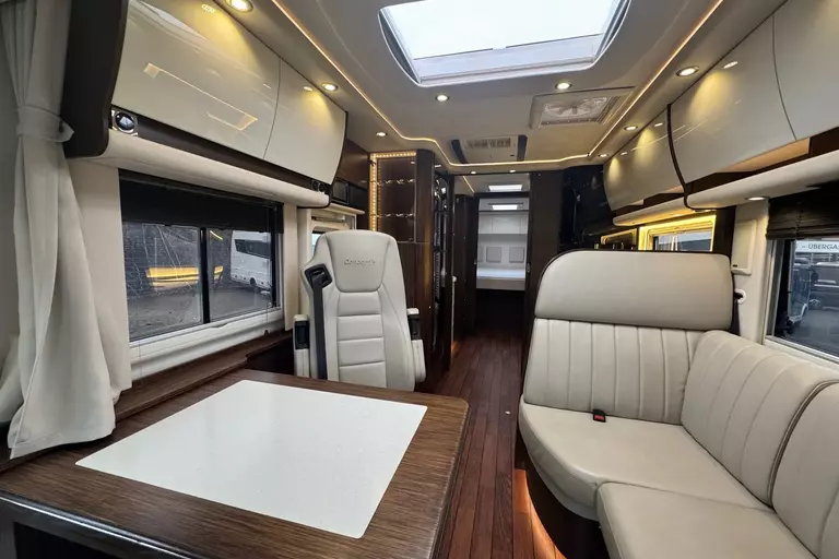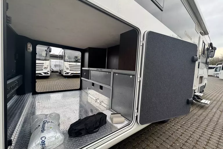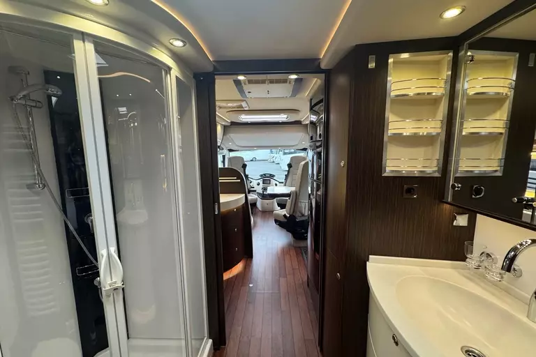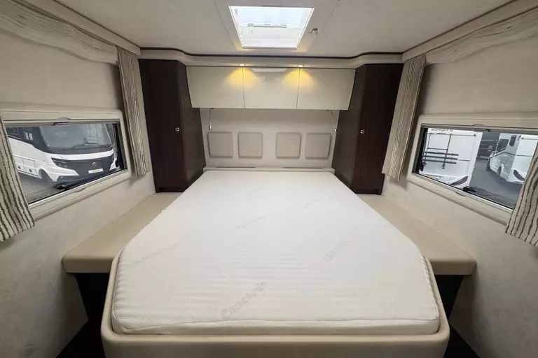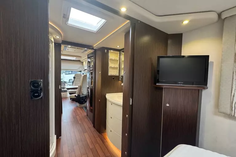 -Sat.-TV-Anl. 2 mit LED-TFT 24" TV im Oberschr. re. elektr. absenkbar Tonwiedergabe über Radioanl. möglich., 2. Sat-Anschluss inkl. 12 V- und Antennensteckdose im Schlafraum (FZ-Gesamthöhe plus ca. 120 mm)