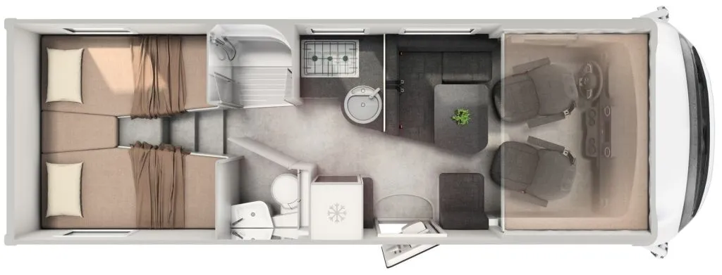 - Front storage lockers instead of fold-down bed (including skylight above kitchen)