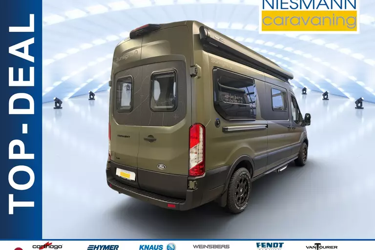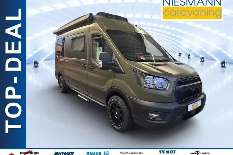 - 4x4 Greentrek equipment (Ford Transit 3,500 kg – 2.0 – 122 kW / 165 HP – Euro 6 – 6-speed manual transmission – all-wheel drive, Yellow Olive, CLIFF 4x4 Green Trek decals, side sleeping extension via rear extensions, framed windows, both rear doors with opening windows (including roller blinds), wrap-around rear overhead storage cabinet, 3.5 m awning (black), Chassis Package, Basic Package, Off-Road Package)