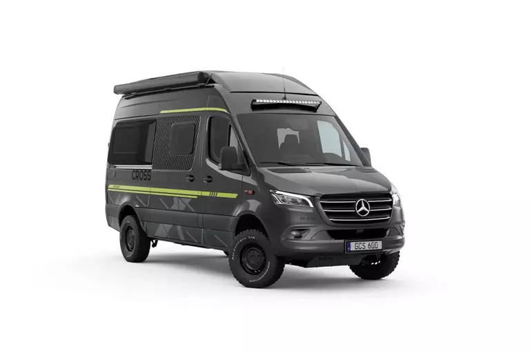 • CrossOver Complete Package Grand Canyon S: 1 x Mercedes-Benz Sprinter 3.88 t - 419 CDI - 140 KW/190 HP - Euro VI-E 1 x Metallic Tenorite Gray 1 x Permanent all-wheel drive including LED taillights 1 x 9G-TRONIC automatic transmission including hold function (x19 CDI) 1 x Chrome radiator grille 1 x LED high-performance headlights 1 x Engine/underbody protection 1 x Fog lights with cornering lights 1 x Bumper and grille frame painted in body color 1 x 16" steel rims (black) with studded tires (all-terrain) 1 x Electric closing aid for the right-hand sliding door 1 x Smartphone storage compartment including wireless charging function and charge level indicator 1 x Instrument panel charging package with 2 x USB-C 5V connectors / 1 x 12V socket 1 x Fully automatic air conditioning THERMOTRONIC 1 x leather steering wheel (with automatic transmission) 1 x heated windshield 1 x navigation & smartphone integration for MBUX system 1 x parking package with 360° camera 1 x active distance assistant DISTRONIC PLUS including steering wheel multifunction buttons 1 x high beam assistant 1 x blind spot assistant 1 x traffic sign assistant 1 x electric off-road step (foldable) for more ground clearance 1 x 44" LED light bar above the driver's cab 1 x crossover design sticker 1 x 6 kW diesel warm air heater with 10 l warm water boiler, air pressure sensor (altitude kit) and 1,800 watt electric heating element 1 x HYMER Smart Battery System 2.0 - additional 3 x 80 Ah LFP (total output 320 Ah) 1 x water filter for fresh water system 1 x ambient light system: Multi-level lighting system with dynamic and individual lighting control (including light temperature) and atmospheric base lighting. 1 x Custom-made fitted sheet for rear beds, individually tailored to the mattresses. 1 x "HOME" interior (2 pillows and fabric bag). 1 x Cork-finished shelf. 1 x Second toilet cassette including bracket. 1 x 2 folding chairs and table including mounting. 1 x Tool set (folding spade, axe) in the rear storage compartment. 1 x Awning with adapter, anthracite housing, 325 x 250 cm. 1 x 95-watt solar panel with solar charge controller (MPPT) and display.