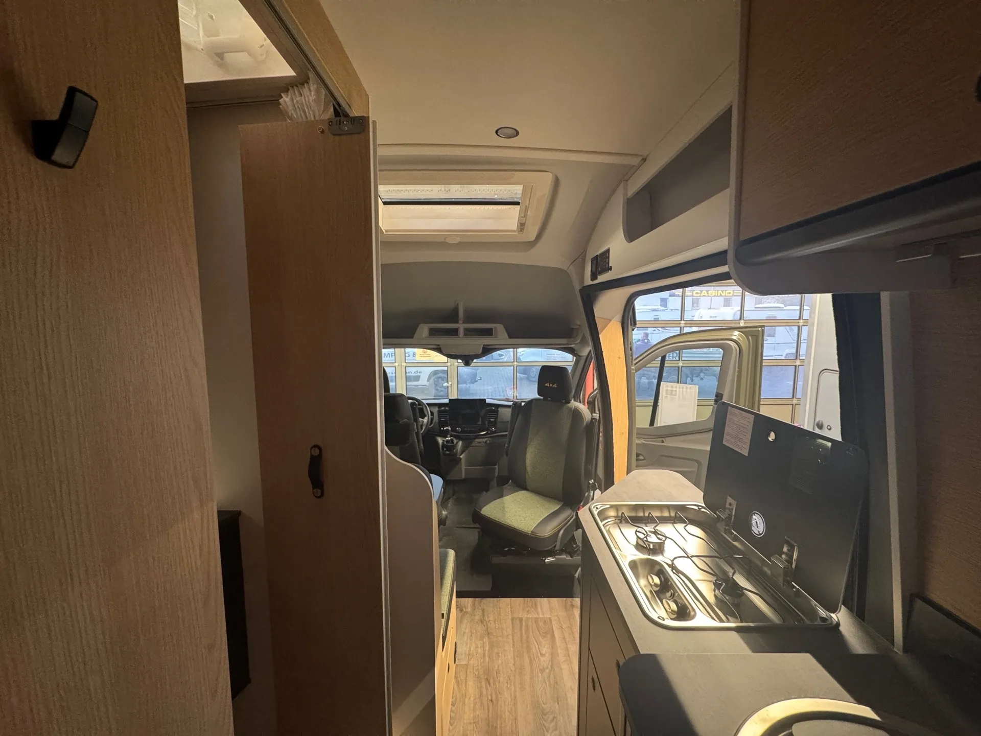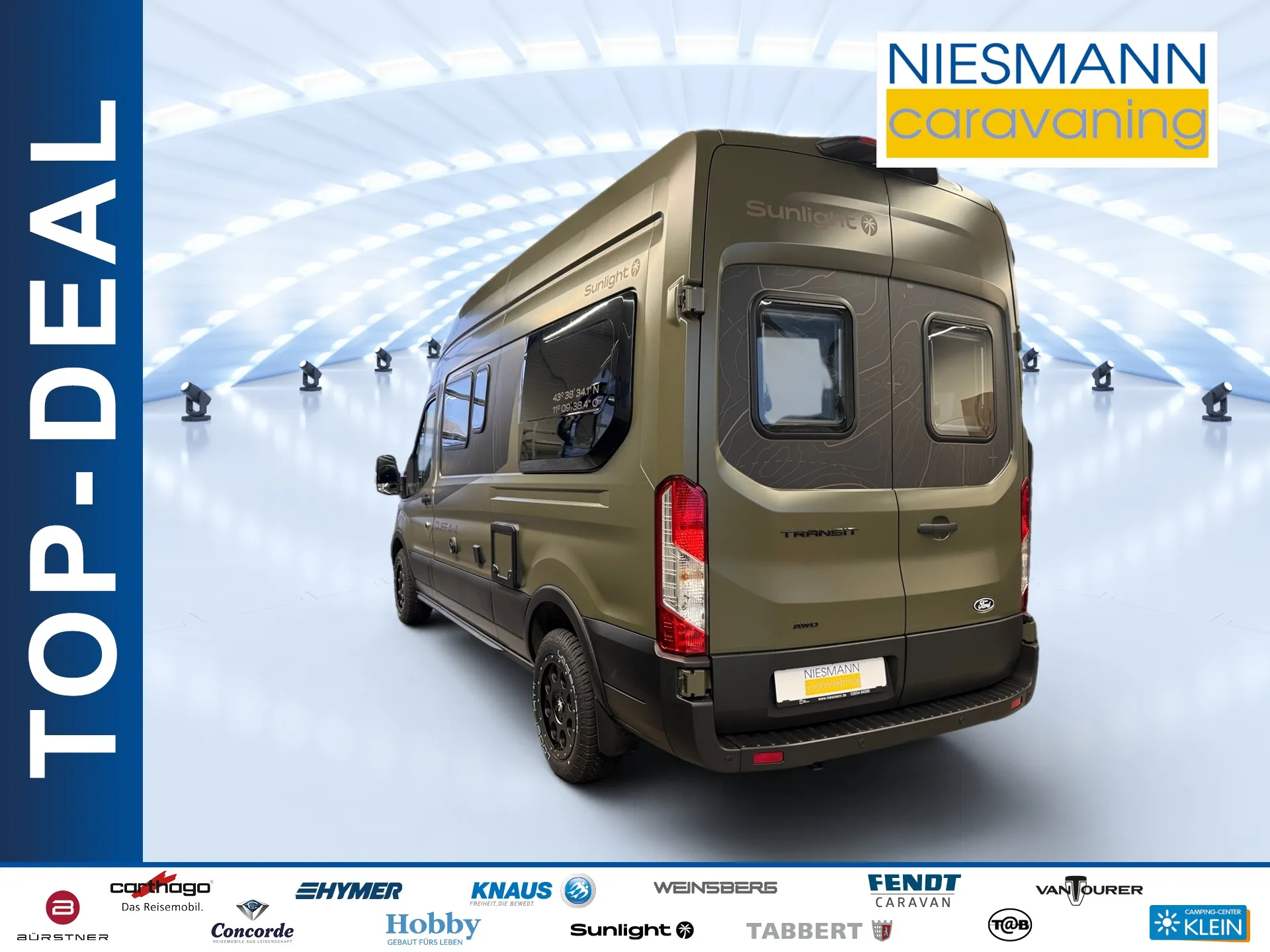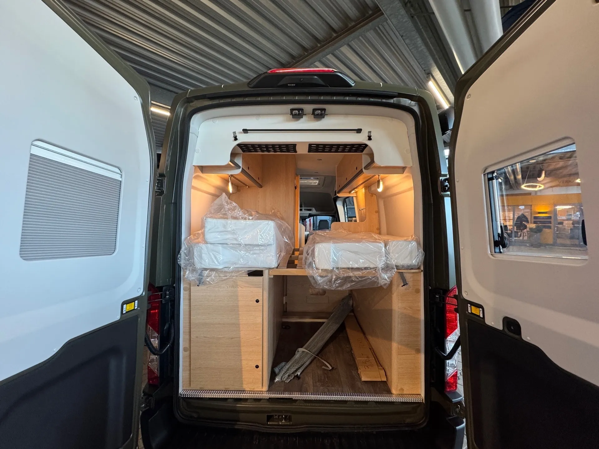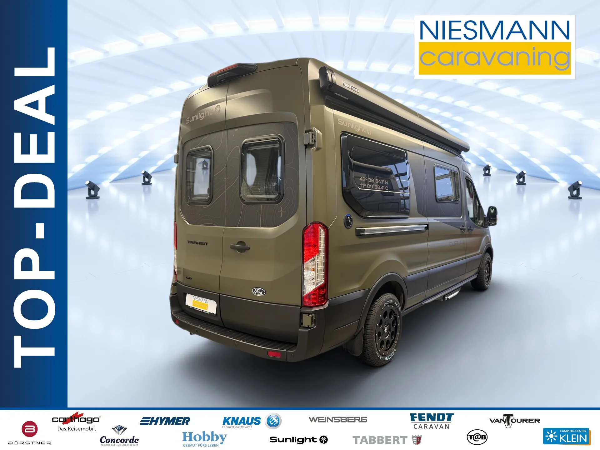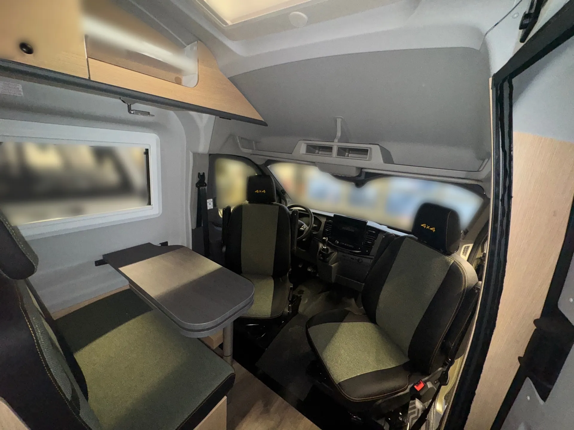 - 4x4 Greentrek equipment (Ford Transit 3,500 kg – 2.0 – 122 kW / 165 HP – Euro 6 – 6-speed manual transmission – all-wheel drive, Yellow Olive, CLIFF 4x4 Green Trek decals, side sleeping extension via rear extensions, framed windows, both rear doors with opening windows (including roller blinds), wrap-around rear overhead storage cabinet, 3.5 m awning (black), Chassis Package, Basic Package, Off-Road Package)