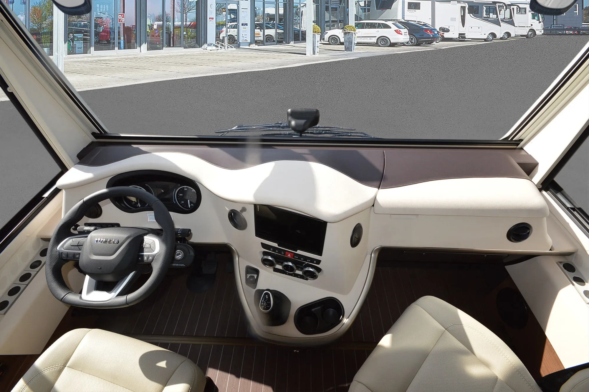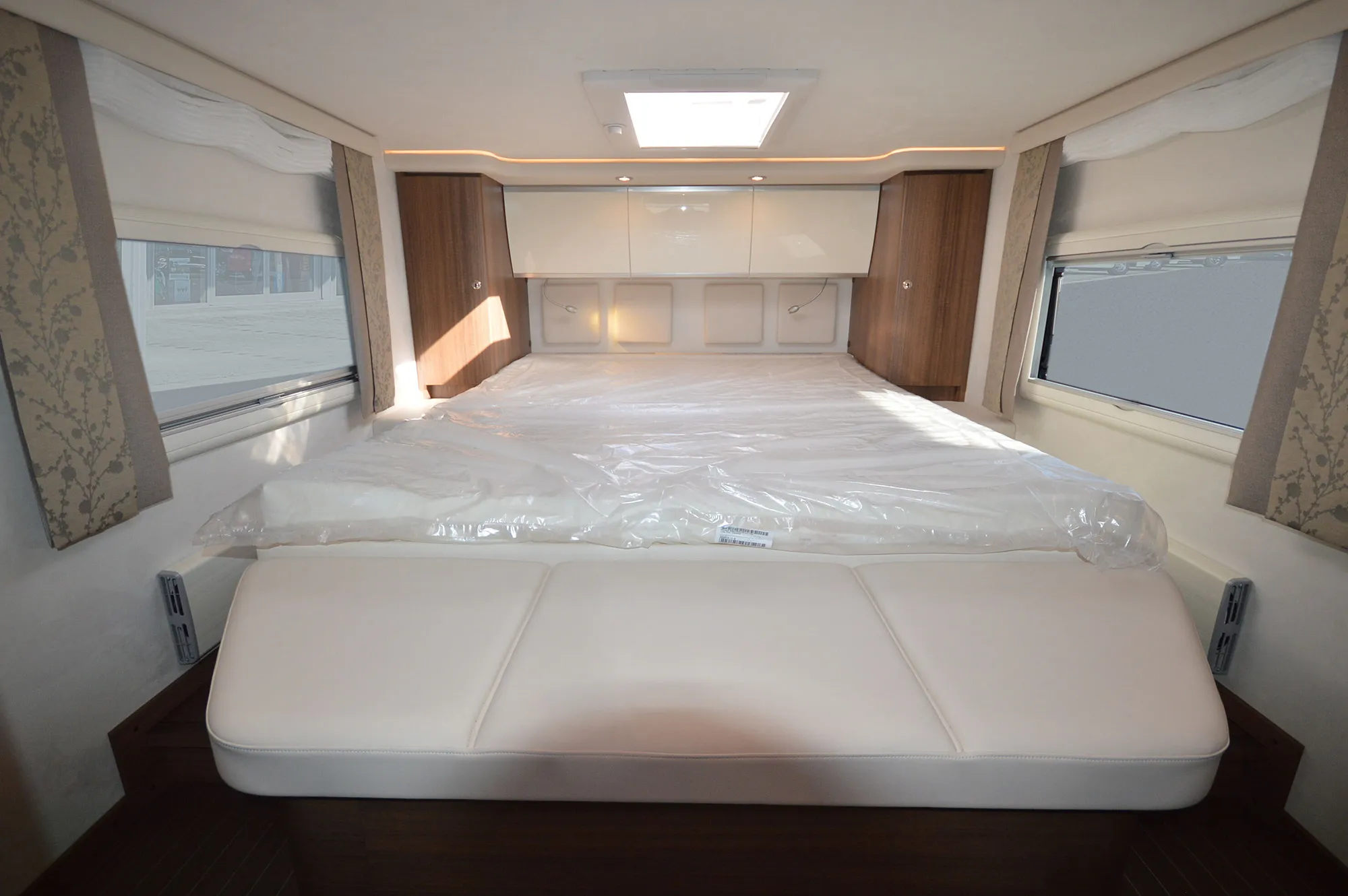 -Ambiente Style Paket 2 (Möbelbau in Jatoba-Brilliant mit Dachschrank-Möbelfronten in "high gloss" Senosan creme weiß und Griffleisten in Edelstahl-Optik, Außendekor „Centurion Style“ inklusive Schriftzug, Aufbaufenster mit Tönung in privacy black, Jalousien Wohnraum in Holzoptik, Objektboden Soft-Walk im Yacht-Style)
