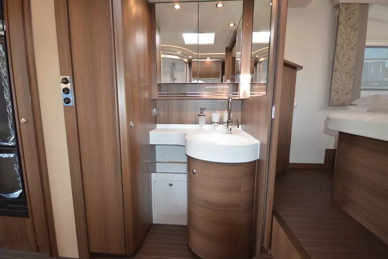 -Satelliten-TV-Anlage mit Full HD LED Smart TV 32" im Oberschrank links, elektrisch absenkbar (Satelliten-TV-Anlage mit 85-cm-Spiegel, vollautomatische Ausrichtung, Mehrteilnehmer-Ausstattung durch TWIN-LNB, Anschluss für zweiten Receiver mit 12 V und Antennensteckdose im Schlafraum, Tonwiedergabe über Radioanlage möglich (Fahrzeuggesamthöhe plus ca. 120 mm) )