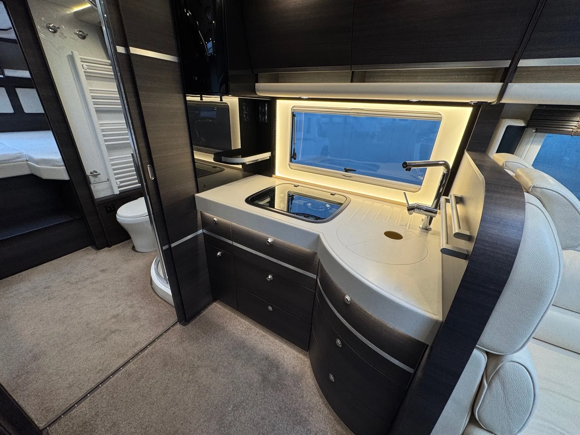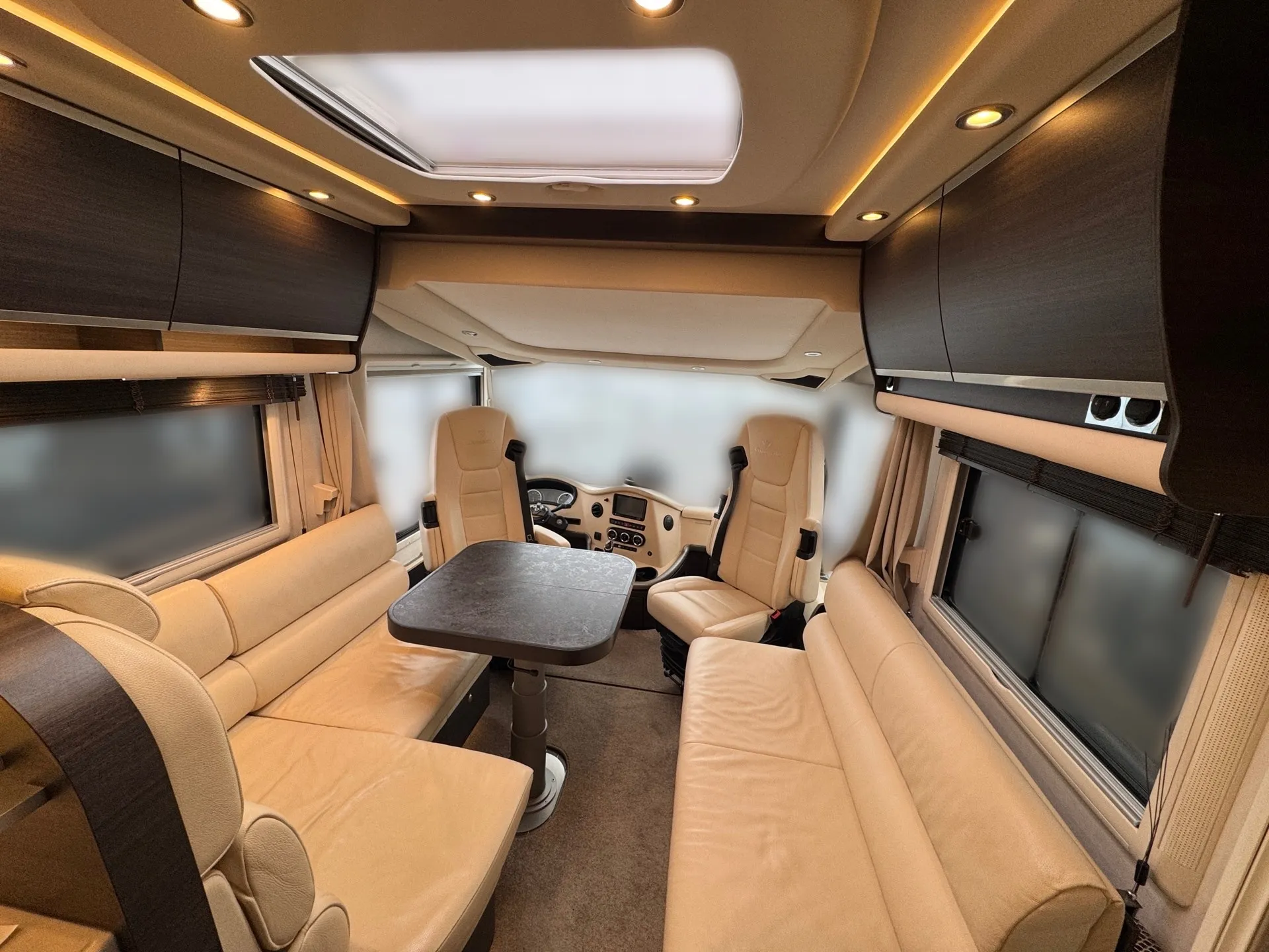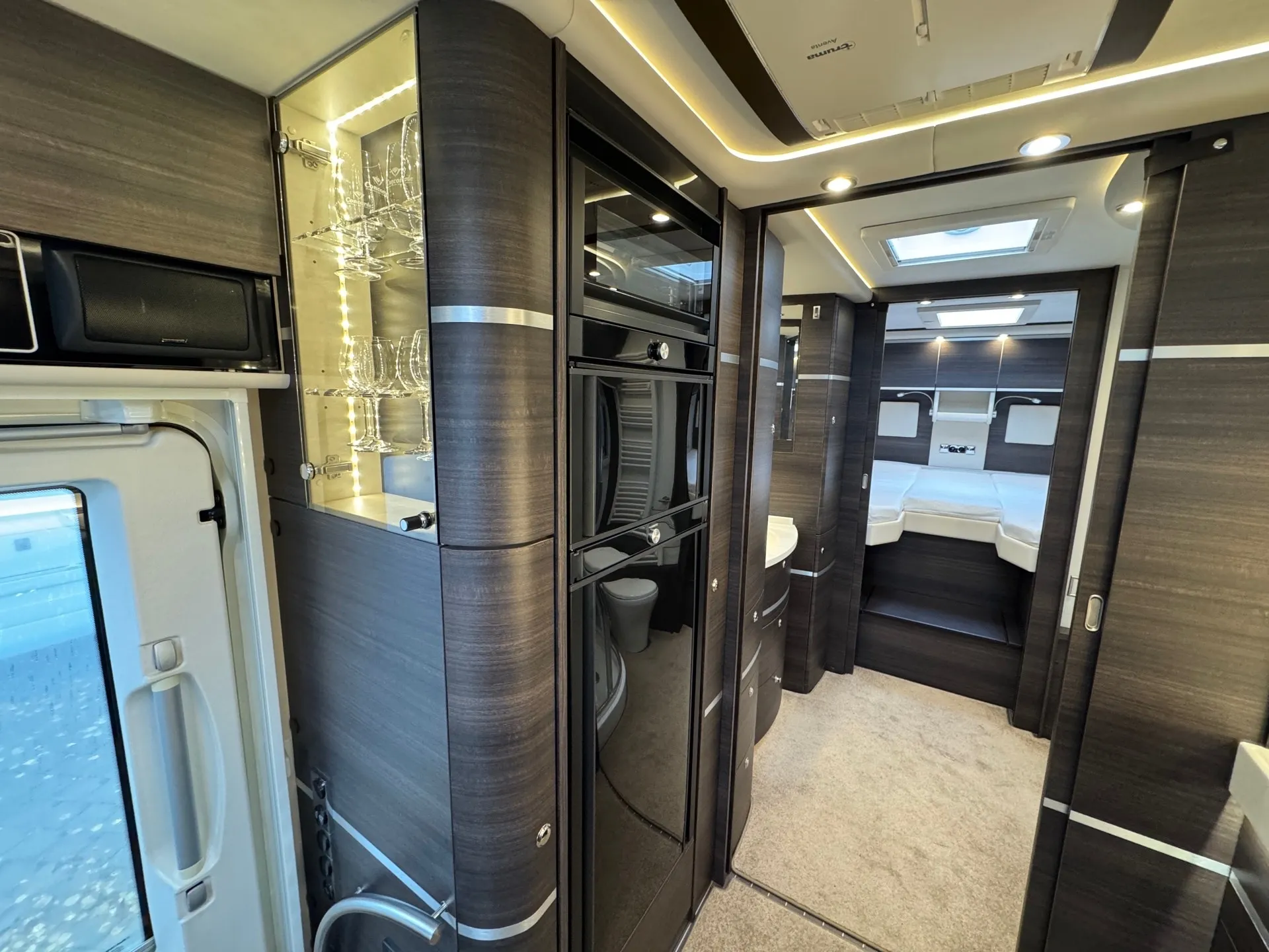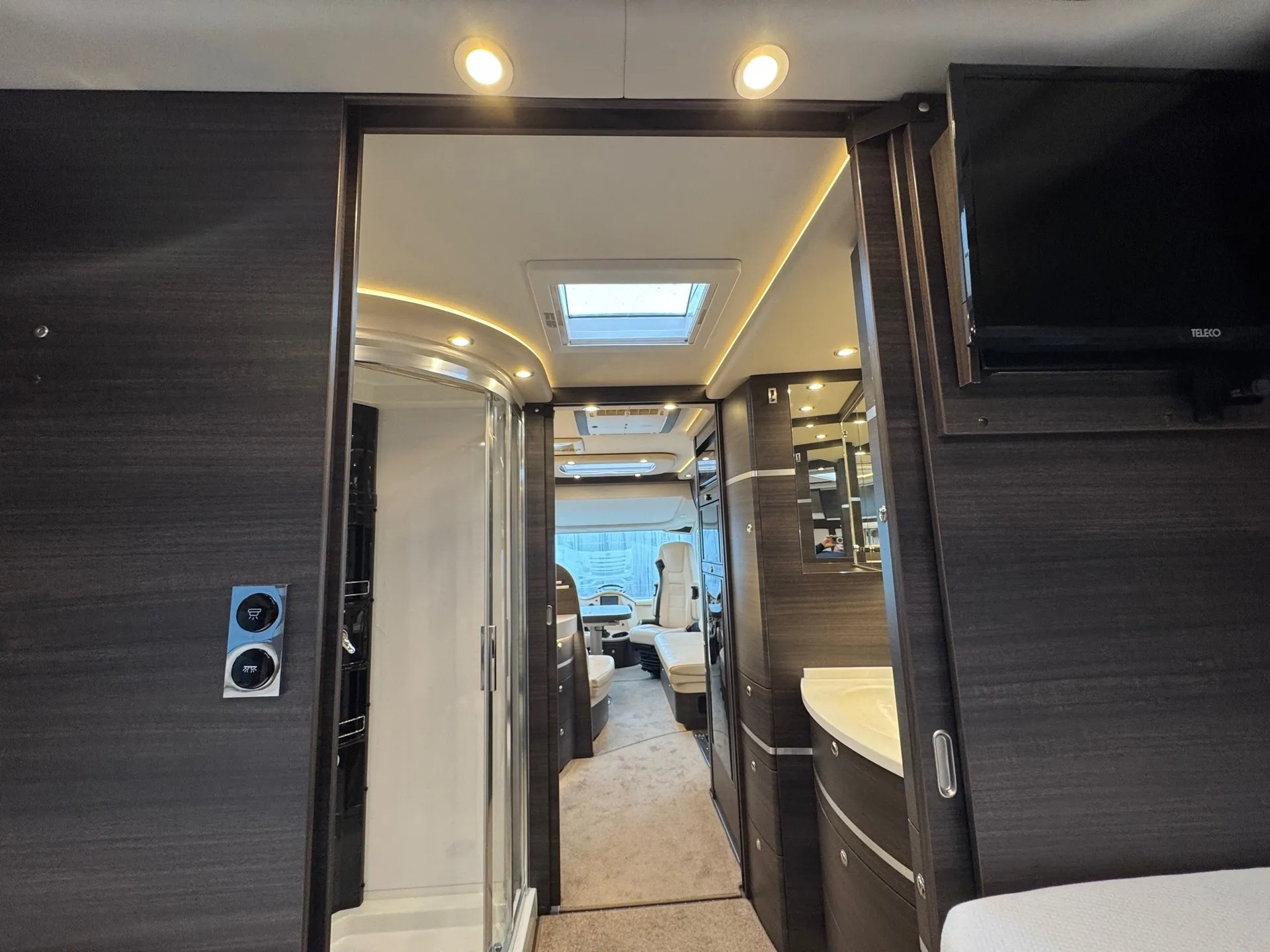 -Satelliten-TV-Anlage mit Full HD LED Smart TV 32 im Oberschrank rechts, elektrisch absenkbar (Satelliten-TV-Anlage mit 85-cm-Spiegel, vollautomatische Ausrichtung, Mehrteilnehmer-Ausstattung durch TWIN-LNB, Anschluss für zweiten Receiver mit 12 V und Antennensteckdose im Schlafraum, Tonwiedergabe über Radioanlage möglich (Fahrzeuggesamthöhe plus ca. 120 mm))
