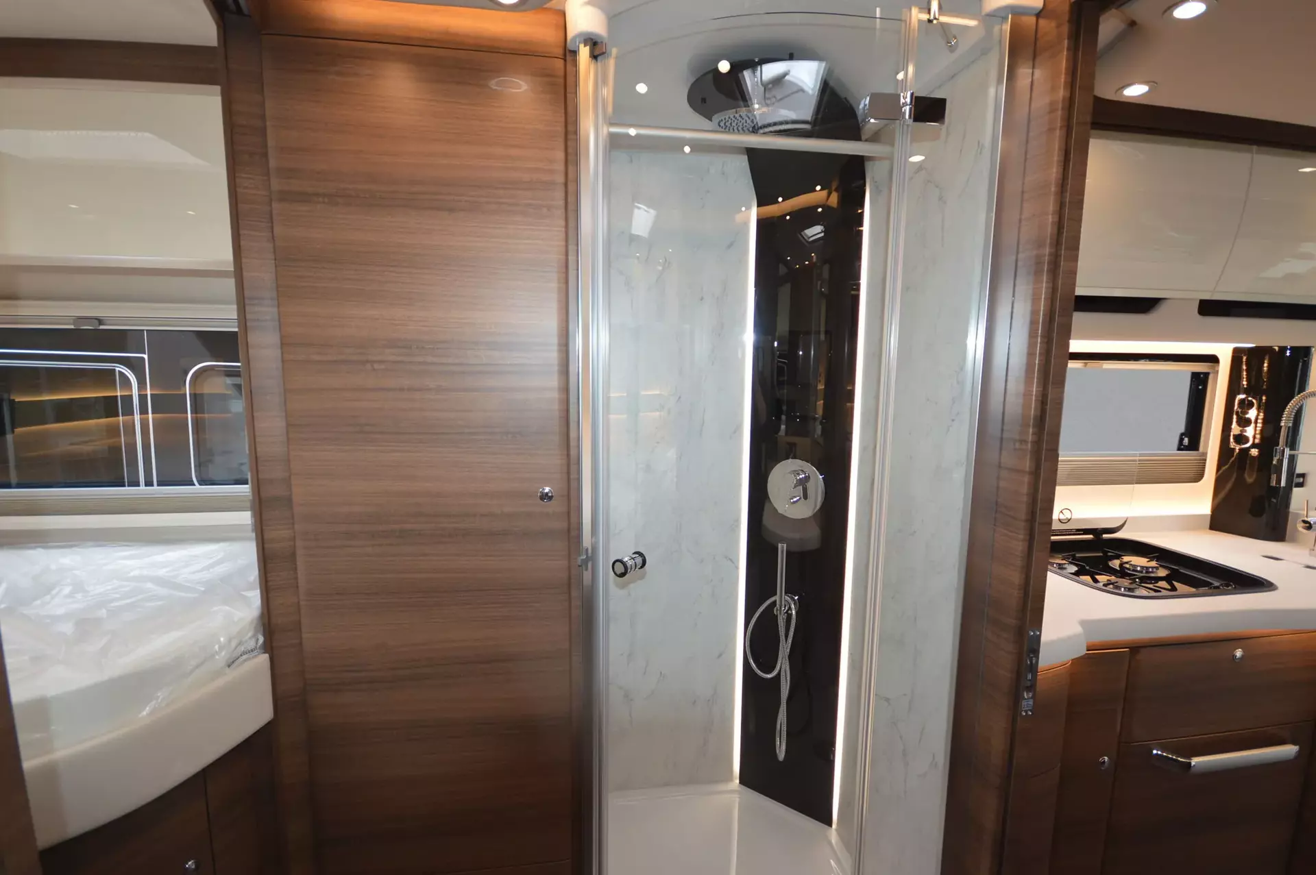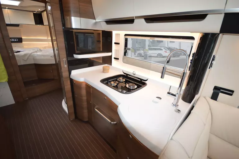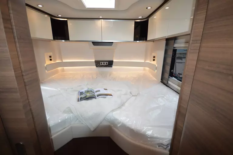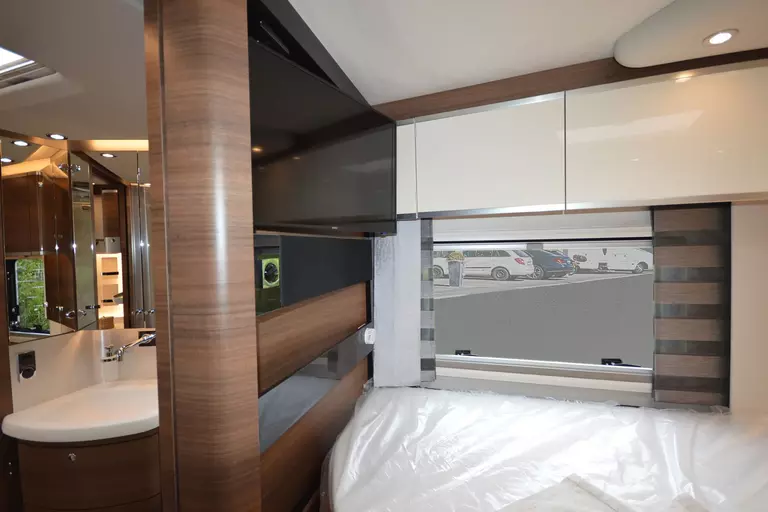 -Satelliten-TV-Anlage mit Full HD LED Smart TV 40" im Oberschrank rechts, elektrisch absenkbar (Satelliten-TV-Anlage mit 85-cm-Spiegel, vollautomatische Ausrichtung, Mehrteilnehmer-Ausstattung durch TWIN-LNB, Anschluss für zweiten Receiver mit 12 V und Antennensteckdose im Schlafraum, Tonwiedergabe über Radioanlage möglich (Fahrzeuggesamthöhe plus ca. 120 mm))