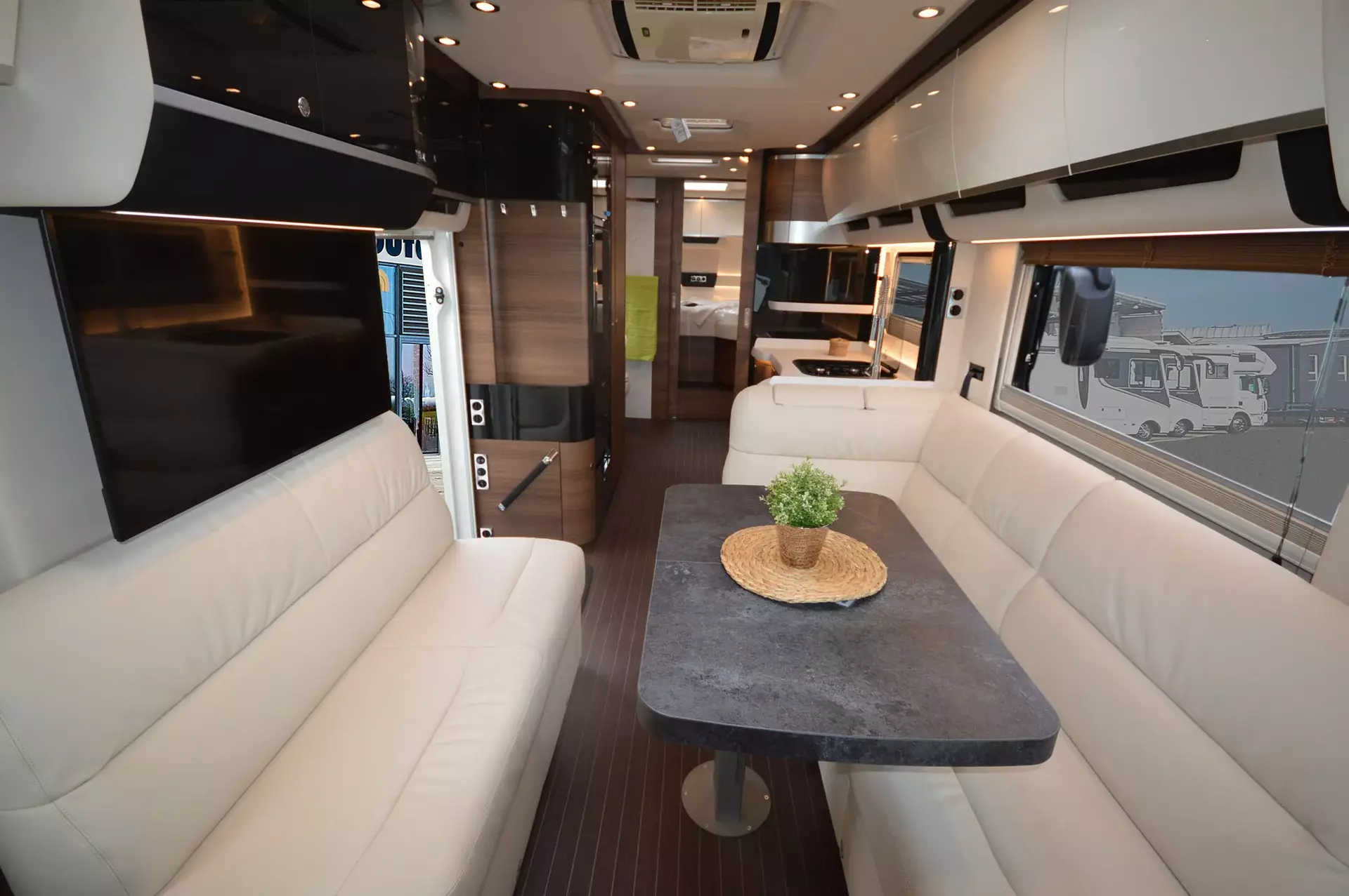 -Ambiente Style Paket 2 (Möbelbau in Jatoba Brilliant mit Dachschrank-Möbelfronten in "high gloss" Senosan creme weiß und Griffleisten in Edelstahl-Optik, Außendekor "Centurion Style" inklusive Schriftzug, Aufbaufenster mit Tönung in privacy black, Jalousien Wohnraum in Holzoptik, Objektbodenbelag Soft-Walk im Yacht-Style)