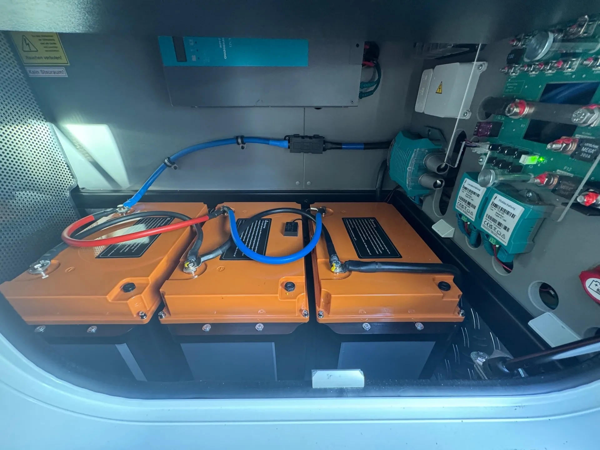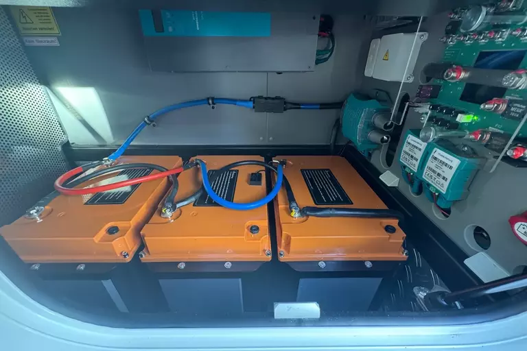 -EDITION 70 Elektro-Leistungspaket: 600 Ah Lithium-Batteriepaket (3 x 200 Ah) mit Kombi-Ladegerät 150 A und Sinus Wechselrichter von 12 V auf 230 V, 6000 W Spitzen- und 3000 W Dauerleistung mit Netzmangelausgleich, sowie Ladewandler 90 A.