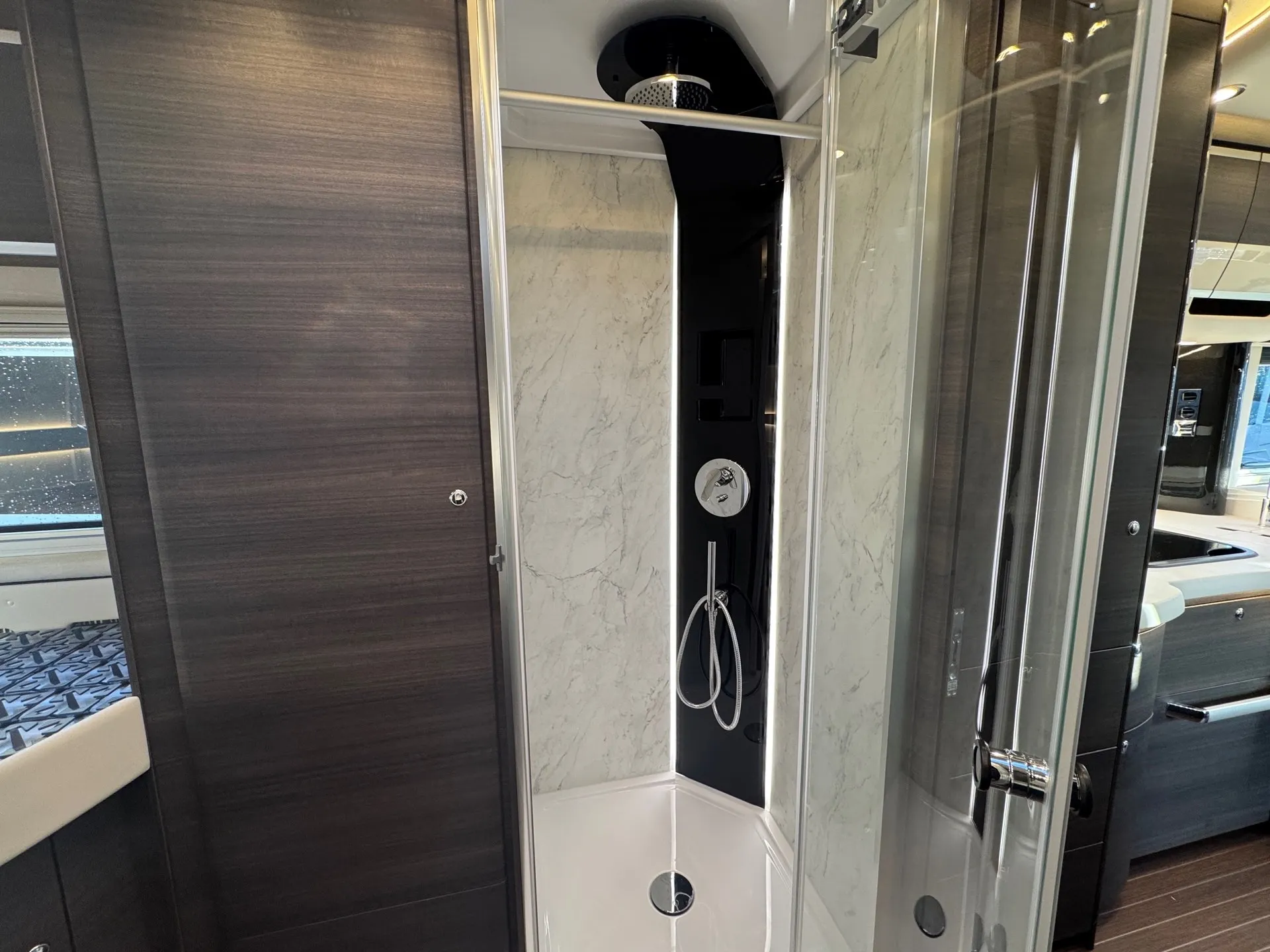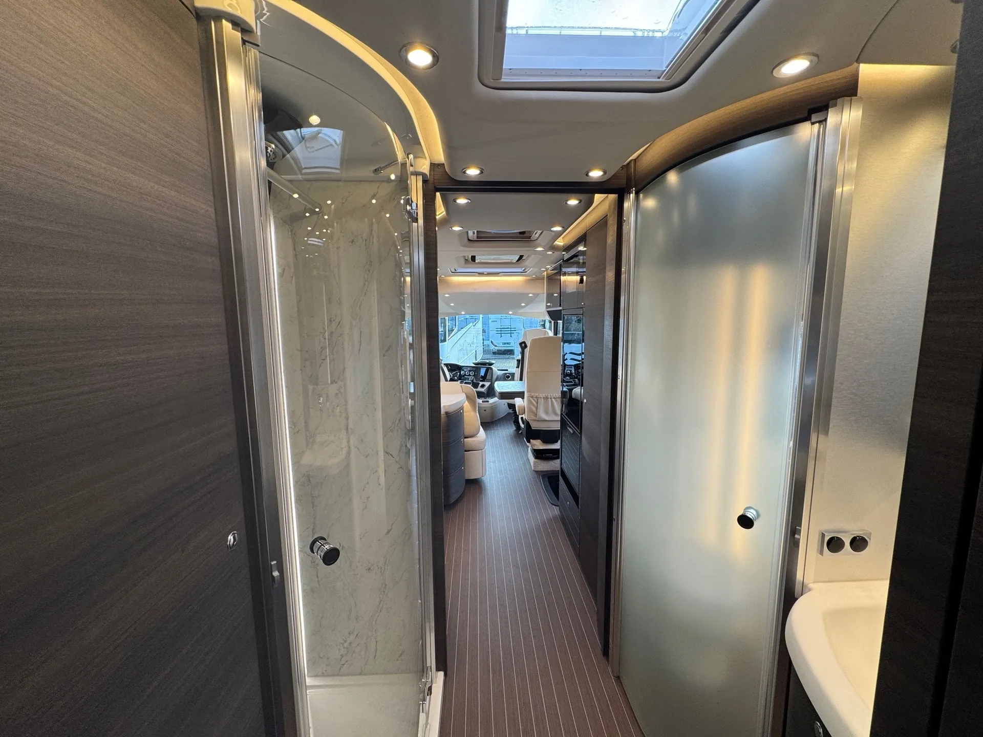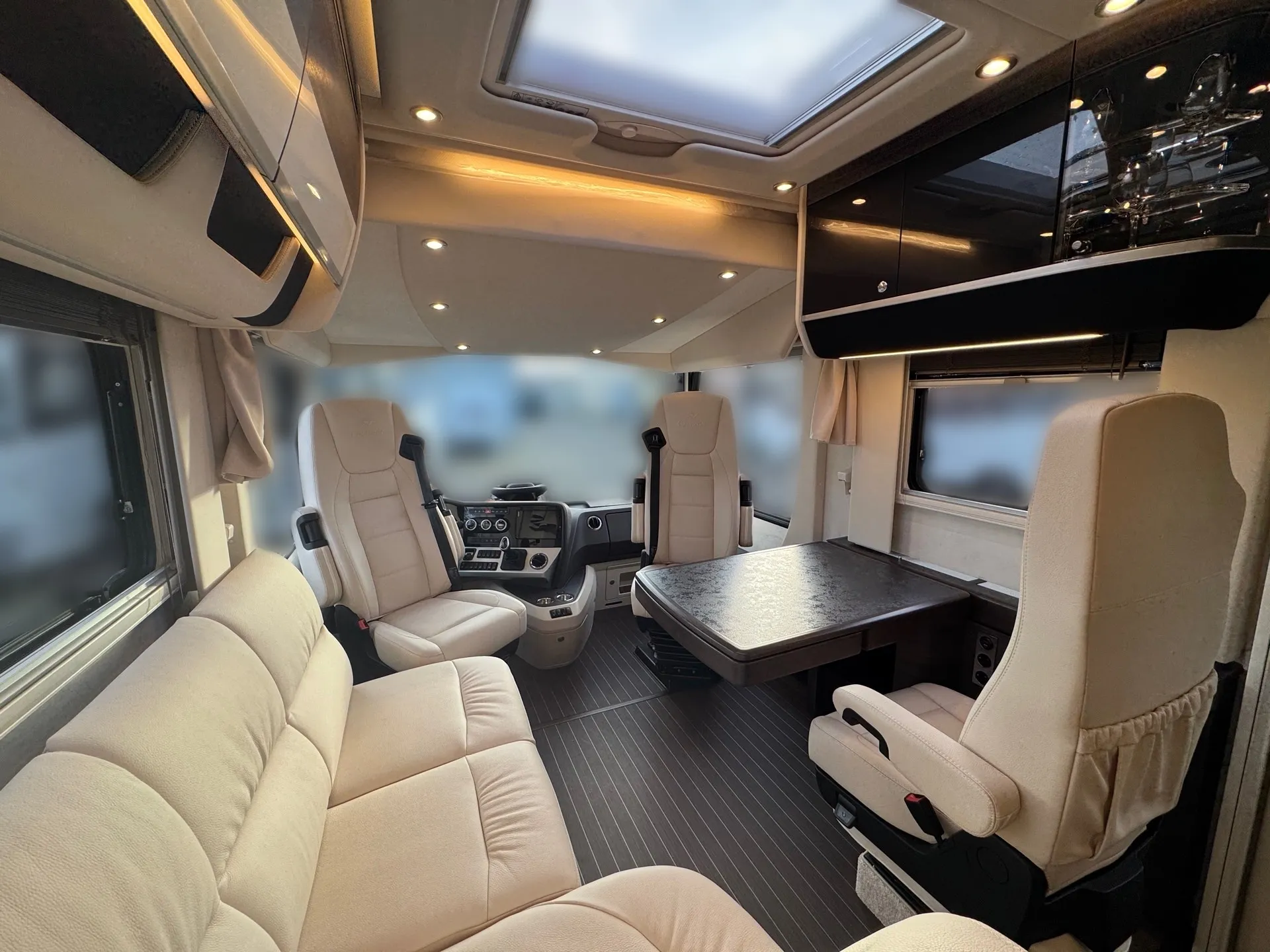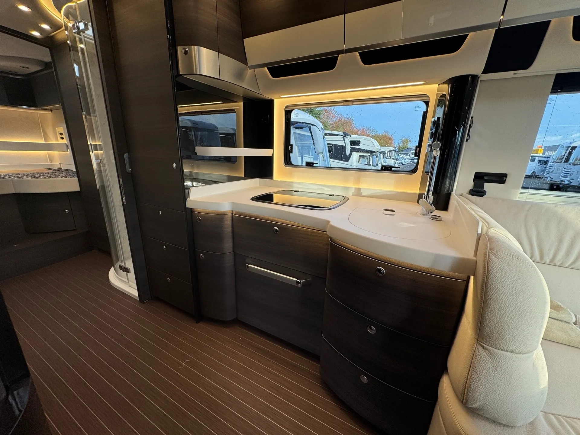 Innen mit Möbelbau in Atlas Zeder und exklusiven Dachschrank-Möbelfronten im Wohnraum in 2/3 Zeder und 1/3 Sensosan creme-weiß mit Griffleisten in Edelstahl-Optik, Jalousien im Wohnraum in Holzoptik und Objektbodenbelag Soft-Walk im Yacht-Style.