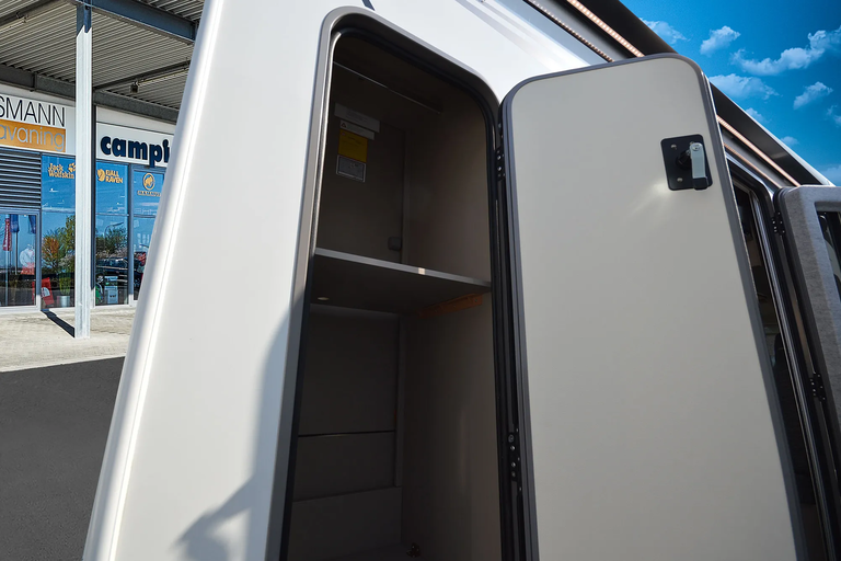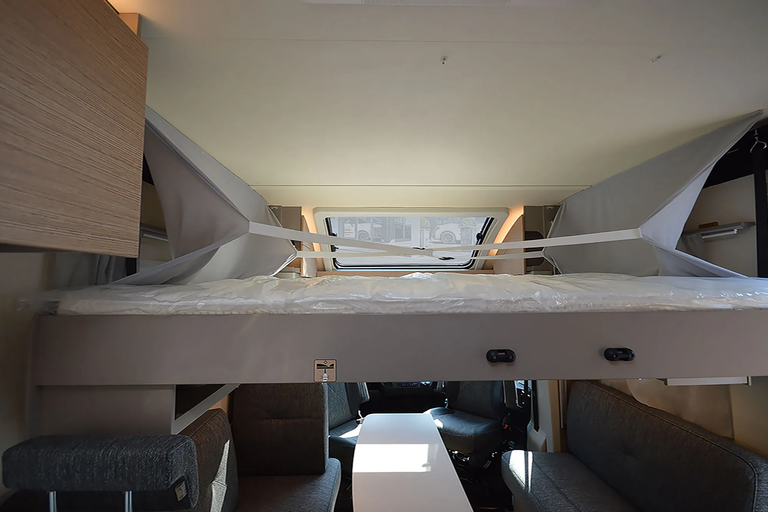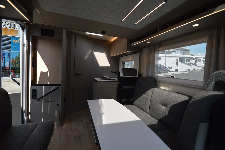 - Komfort Paket 2 (Fahrerhausverdunkelung, Cassettenplissees Front- und Seitenscheiben, Sun-Roof (Aufstellbar, mit Verdunkelung und Fliegenschutz), Aufbautür breite Ausführung (mit Fenster und Zentralverriegelung), Alurahmenfenster, Dachfenster 50 x 70 cm mit Verdunkelungsrollo und Fliegenschutz im Wohnbereich, Elektrisch ausfahrbare Einstiegsstufe, Licht Paket, 7 Display für My Bürstner App)