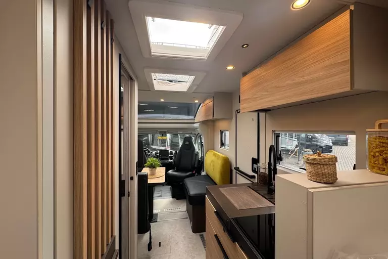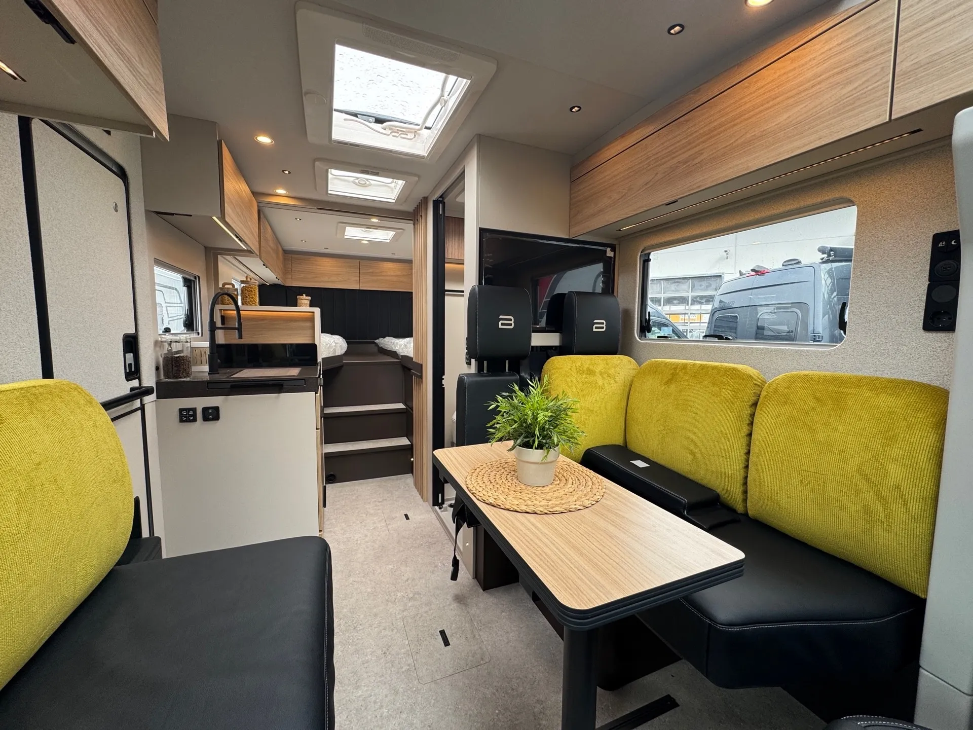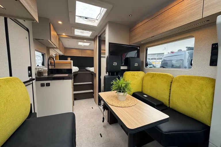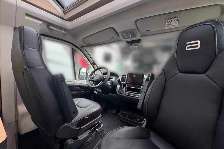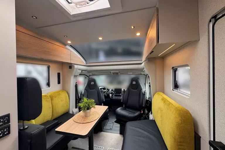 - Sofa Fahrerseite zur L-Sitzbank umbaubar 4 Gurtsitze gesamt, inkl. klappbarer Tischplatte und schiebbarem Tisch durch Bodenschienensystem
