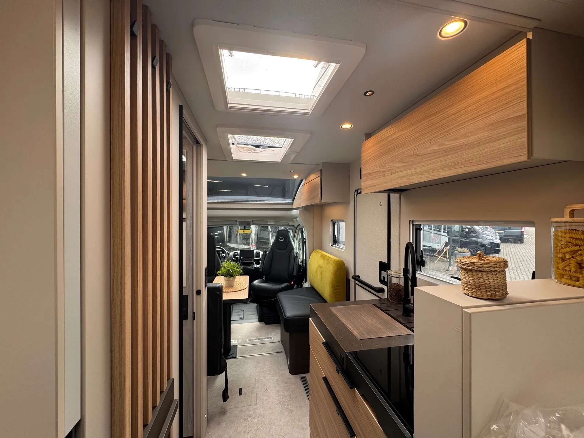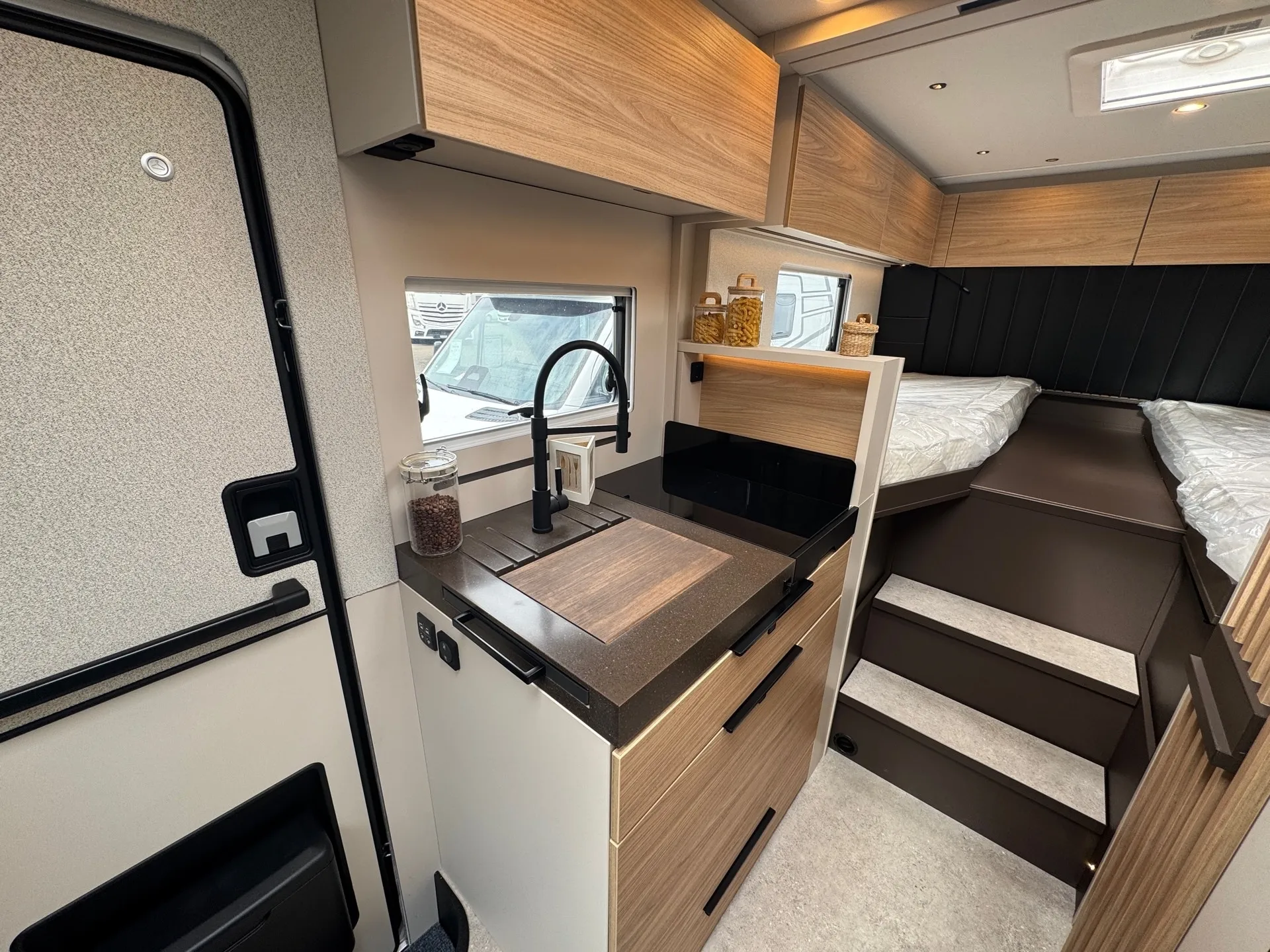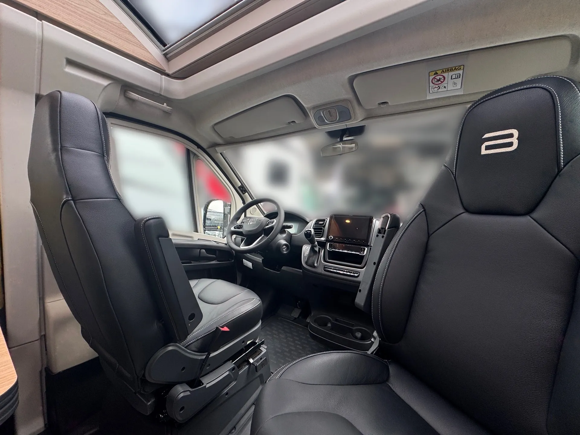 - Sofa Fahrerseite zur L-Sitzbank umbaubar 4 Gurtsitze gesamt, inkl. klappbarer Tischplatte und schiebbarem Tisch durch Bodenschienensystem