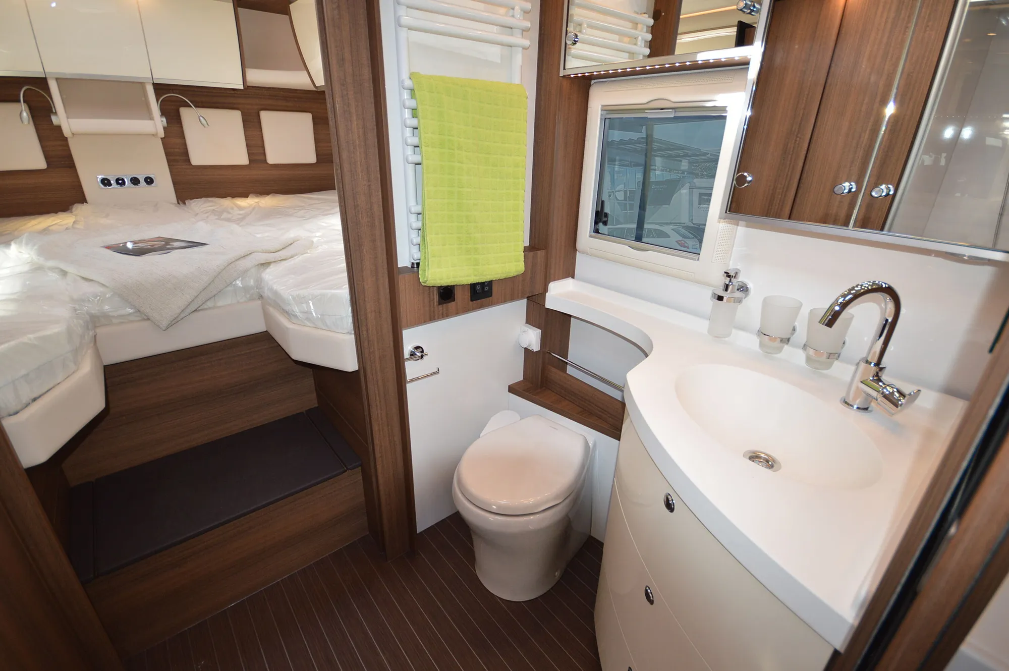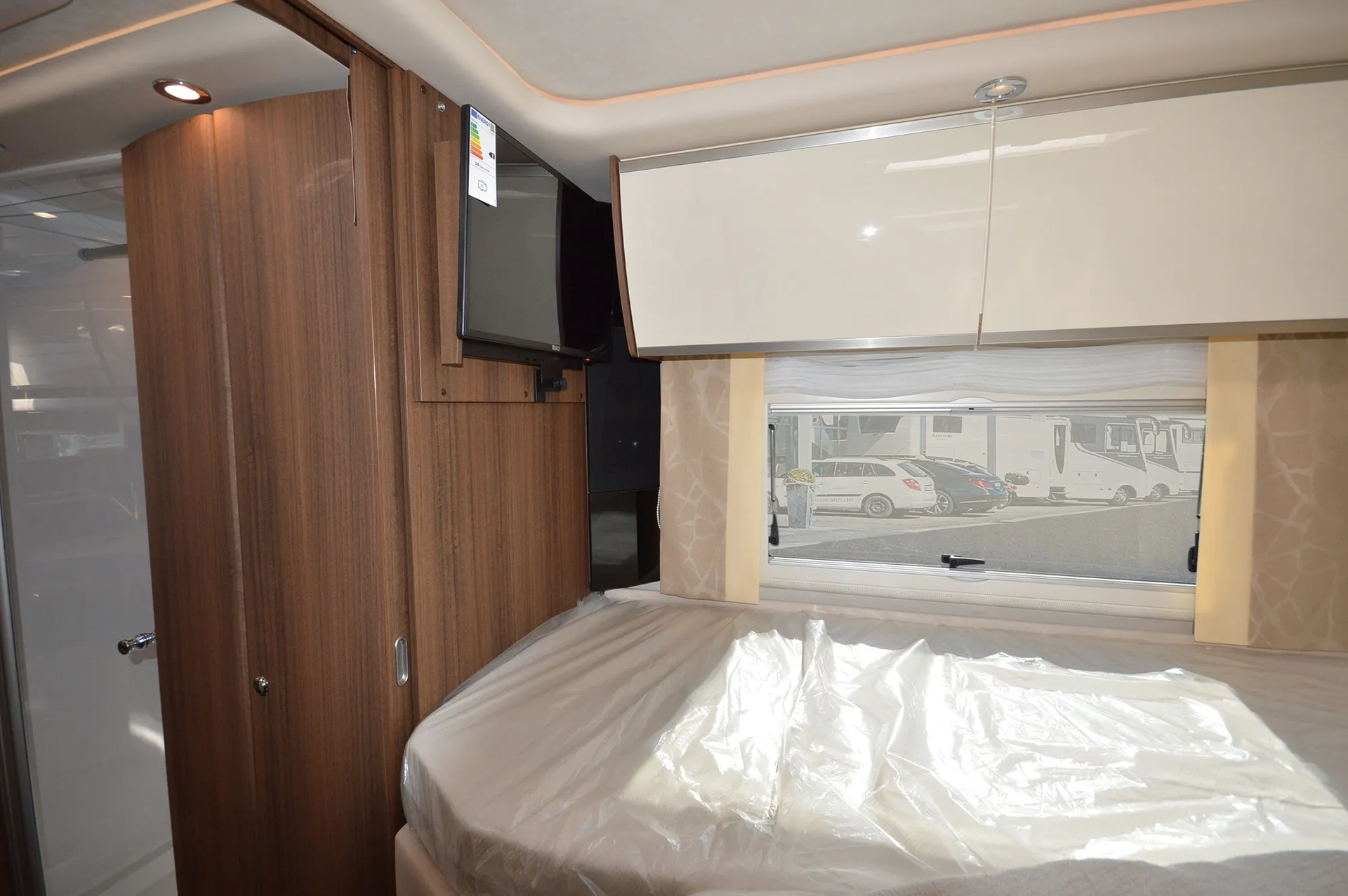 -Satelliten-TV-Anlage mit Full HD LED Smart TV 24" im Eingangsbereich (Satelliten-TV-Anlage mit 85-cm-Spiegel, vollautomatische Ausrichtung, Mehrteilnehmer-Ausstattung durch TWIN-LNB, Anschluss für zweiten Receiver mit 12 V und Antennensteckdose im Schlafraum, Tonwiedergabe über Radioanlage möglich (Fahrzeuggesamthöhe plus ca. 120 mm))