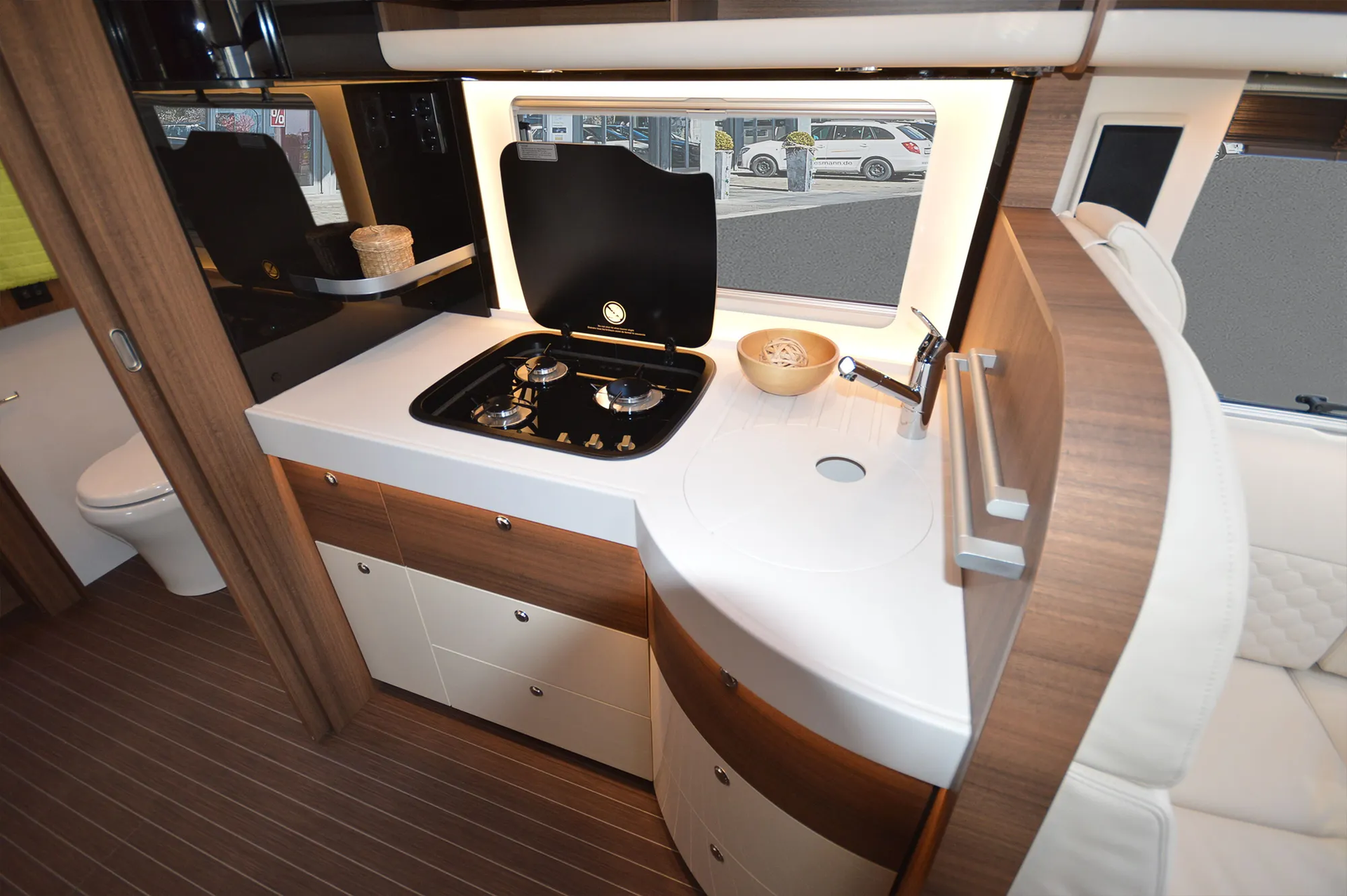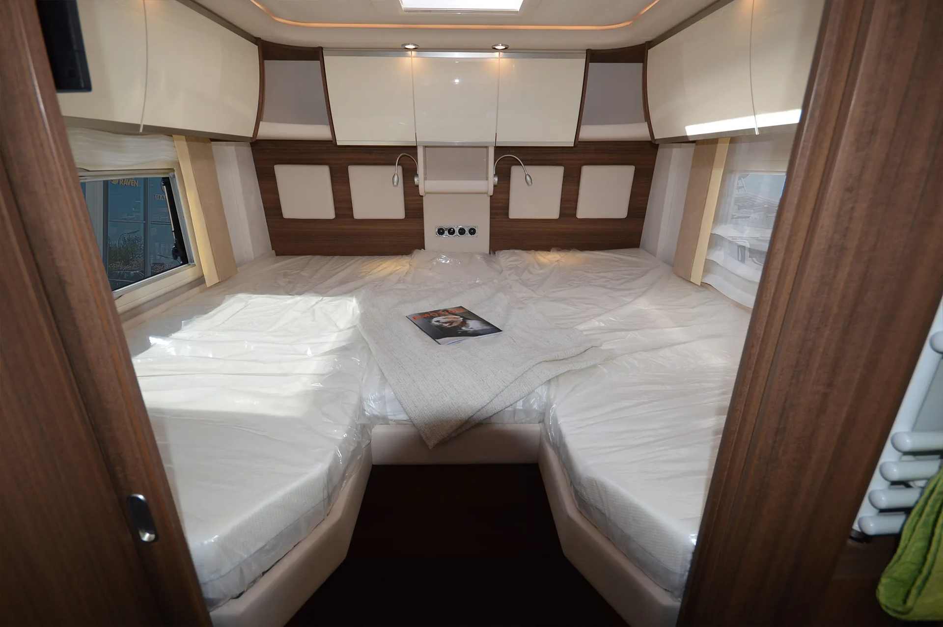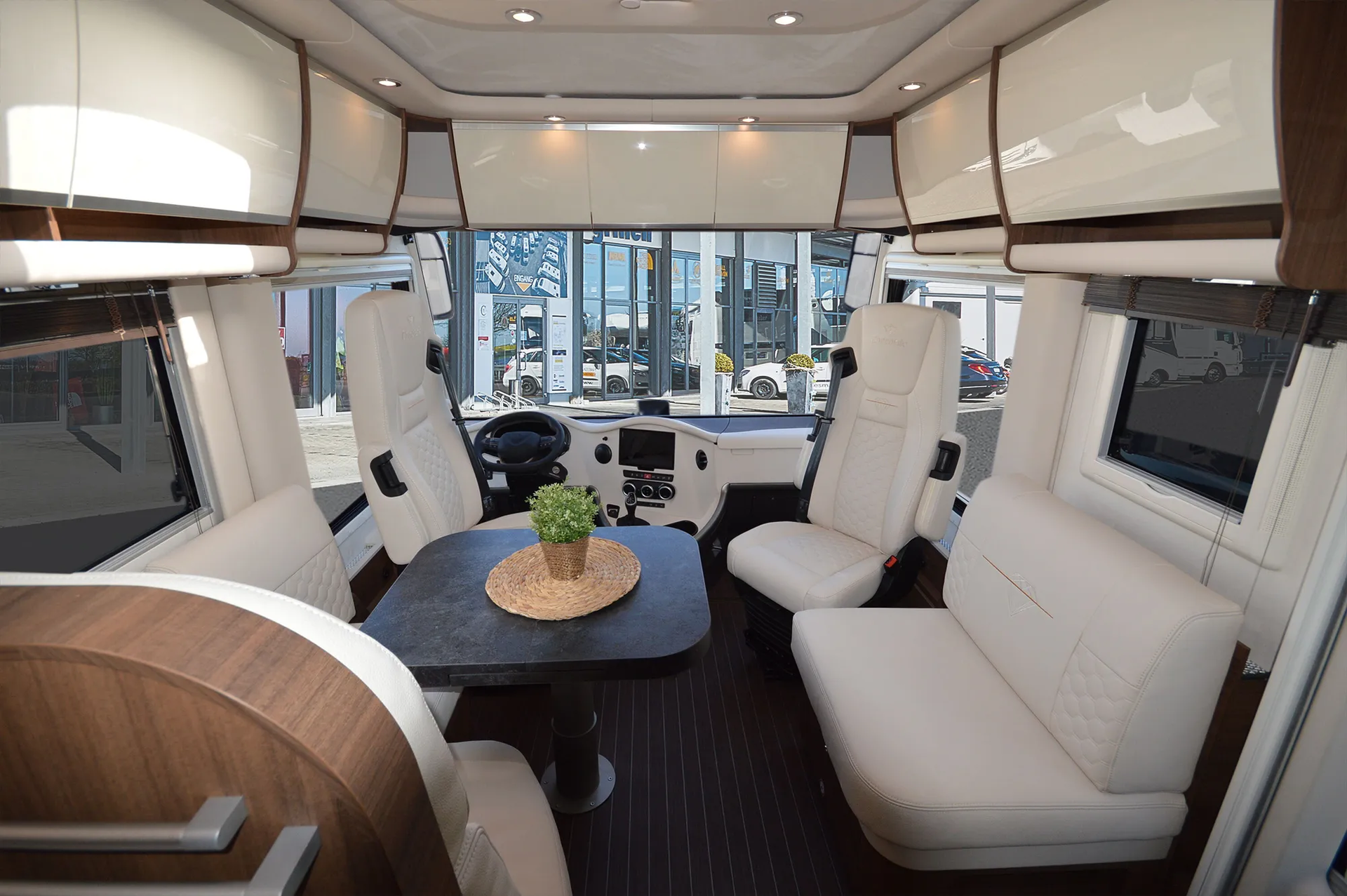 -Ambiente Style Paket 2 (Möbelbau in Jatoba-Brilliant mit Dachschrank-Möbelfronten in "high gloss" Senosan creme weiß und Griffleisten in Edelstahl-Optik, Außendekor "Centurion Style" inklusiv Schriftzug, Aufbaufenster mit Tönung in privacy black, Jalousien Wohnraum in Holzoptik, Objektboden Soft-Walk im Yacht-Style)
