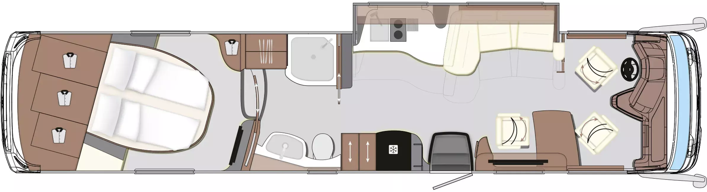 -Sitzgruppe Fahrerseite Slide-Out: Havanna Lounge mit zwei elektrisch verstellbaren Relax-Sesseln mit Beinauflage (ohne Gurtplätze)