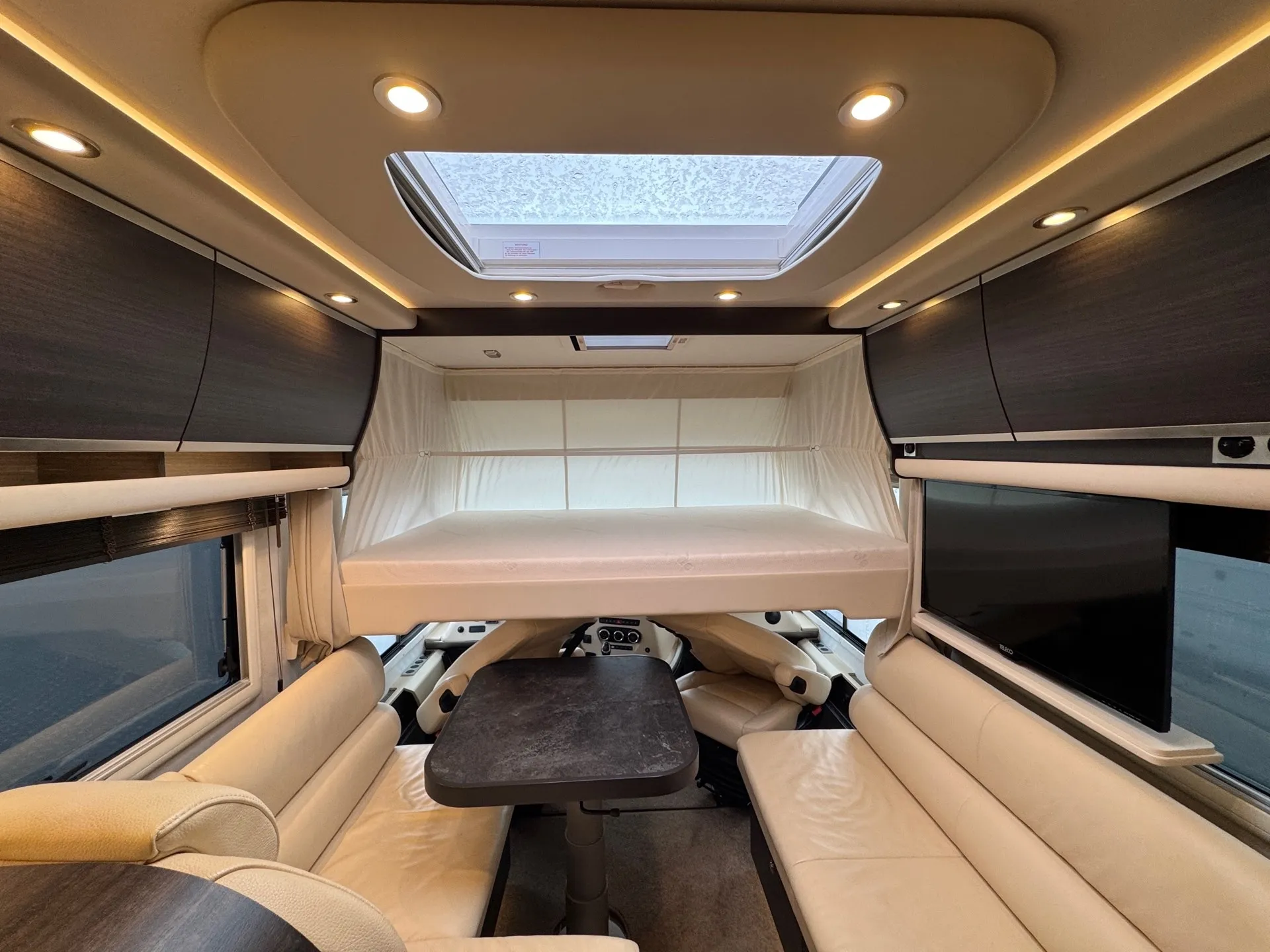 -Satelliten-TV-Anlage mit Full HD LED Smart TV 32 im Oberschrank rechts, elektrisch absenkbar (Satelliten-TV-Anlage mit 85-cm-Spiegel, vollautomatische Ausrichtung, Mehrteilnehmer-Ausstattung durch TWIN-LNB, Anschluss für zweiten Receiver mit 12 V und Antennensteckdose im Schlafraum, Tonwiedergabe über Radioanlage möglich (Fahrzeuggesamthöhe plus ca. 120 mm))