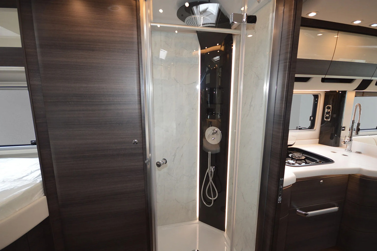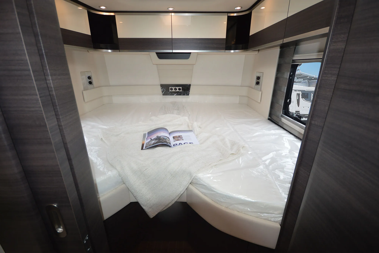 -Satelliten-TV-Anlage mit Full HD LED Smart TV 40" im Oberschrank rechts, elektrisch absenkbar (Satelliten-TV-Anlage mit 85-cm-Spiegel, vollautomatische Ausrichtung, Mehrteilnehmer-Ausstattung durch TWIN-LNB, Anschluss für zweiten Receiver mit 12 V und Antennensteckdose im Schlafraum, Tonwiedergabe über Radioanlage möglich (Fahrzeuggesamthöhe plus ca. 120 mm))