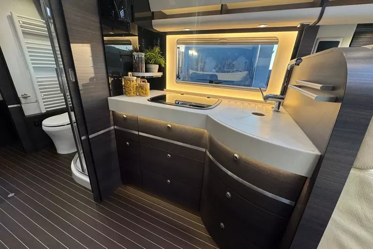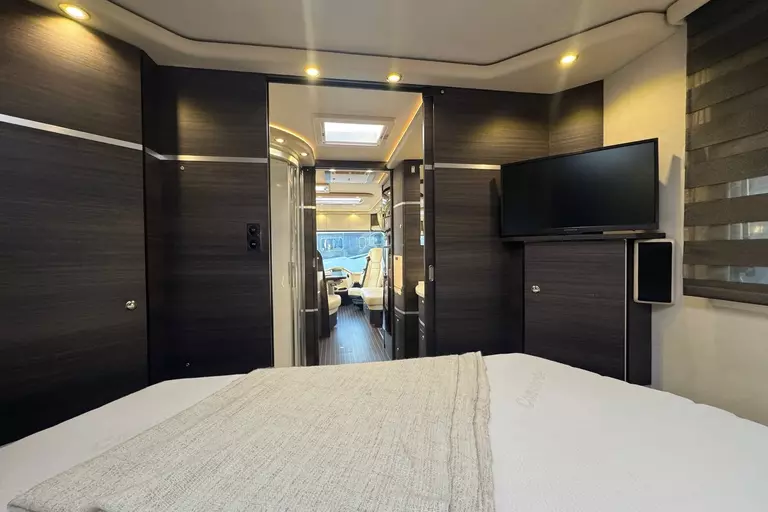 -Satelliten-TV-Anlage 3 (mit LED-Flachbildschirm 32 im Oberschrank rechts, elektrisch absenkbarSatelliten-TV-Anlage mit 85-cm-Spiegel, vollautomatische Ausrichtung, Mehrteilnehmer-Ausstattung durch TWIN-LNB, Anschluss für zweiten Receiver mit 12 V und Antennensteckdose im Schlafraum, Tonwiedergabe über Radioanlage möglich (Fahrzeuggesamthöhe plus ca. 120 mm))