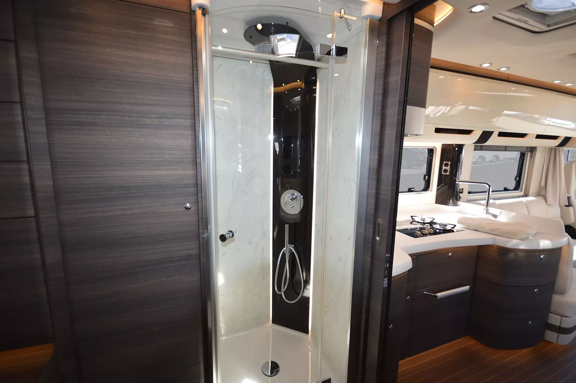 -Aufbautür "Diamond Glance" mit Echtglas Exterieur (Soft Close und open Funktion sowie schlüsselloses Zugangssystem. Coming Home und Leaving Home Außenbeleuchtung)