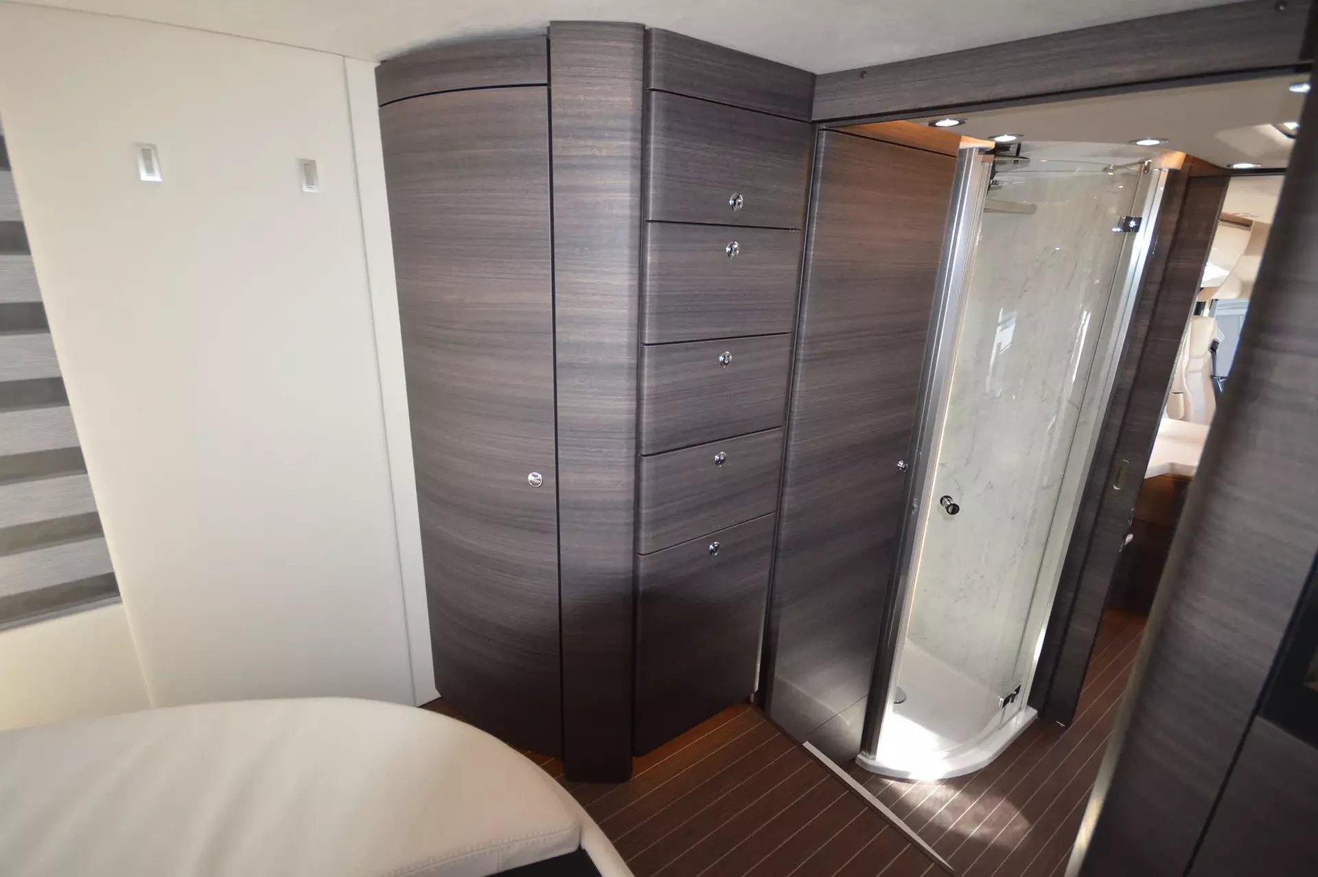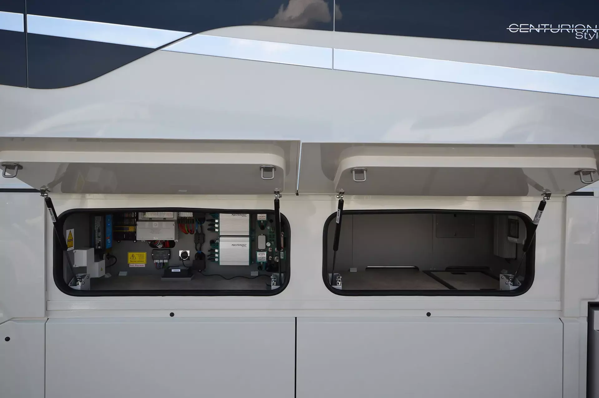 -Centurion Style-Paket 2 (Möbelbau in Atlas Zeder mit Dachschrank-Möbelfronten in "high gloss" Senosan creme weiß und Griffleisten in Edelstahl-Optik, Außendekor "Centurion Style" inklusiv Schriftzug, Aufbaufenster mit Tönung in privacy black, Jalousien Wohnraum in Holzoptik, Objektbodenbelag Soft-Walk im Yacht-Style)