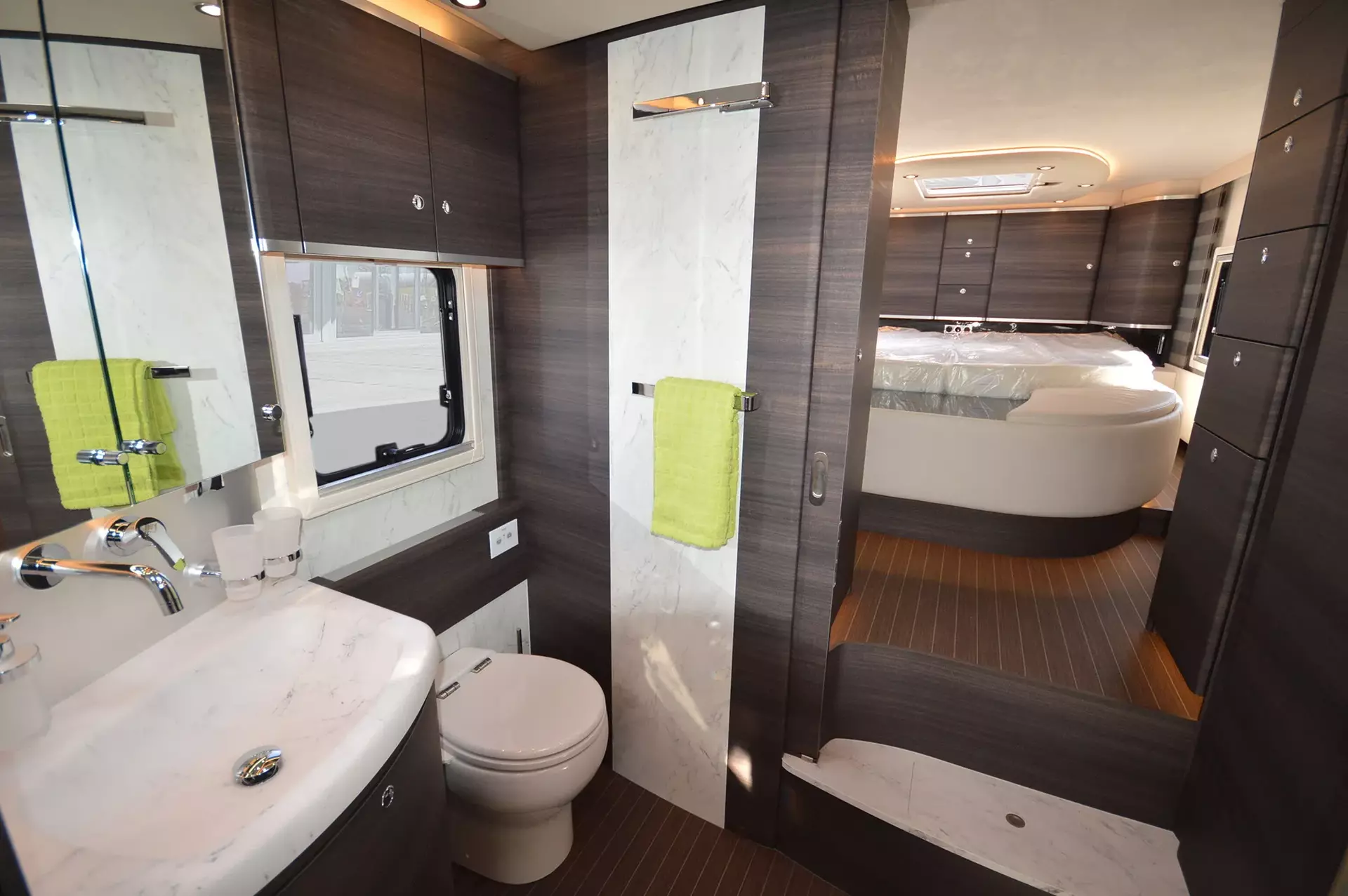 -Satelliten-TV-Anlage mit Full HD LED Smart TV 40" im Oberschrank rechts, elektrisch absenkbar (Satelliten-TV-Anlage mit 85-cm-Spiegel, vollautomatische Ausrichtung, Mehrteilnehmer-Ausstattung durch TWIN-LNB, Anschluss für zweiten Receiver mit 12 V und Antennensteckdose im Schlafraum, Tonwiedergabe über Radioanlage möglich (Fahrzeuggesamthöhe plus ca. 120 mm))