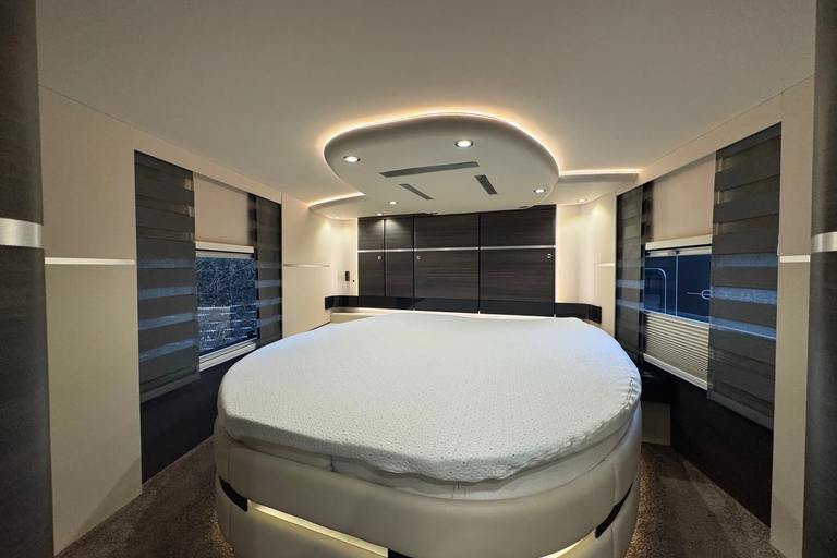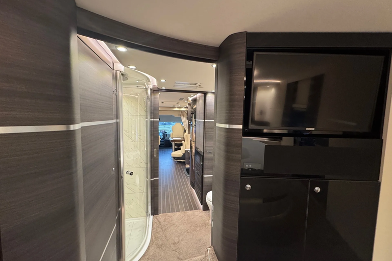 -SAT-TV-Anlage mit 40" LED-TFT in Media-Schrank rechts, elektrisch ausfahrbar (SAT-TV-Anlage mit 85 cm-Spiegel, vollautomatische Ausrichtung, Mehrteilnehmer-Ausstattung durch TWIN-LNB, Anschluss für zweiten Receiver mit 12 V / 230 V und Antennensteckdose im Schlafraum, Tonwiedergabe über Radioanlage (Fahrzeuggesamthöhe plus ca. 100 mm)
