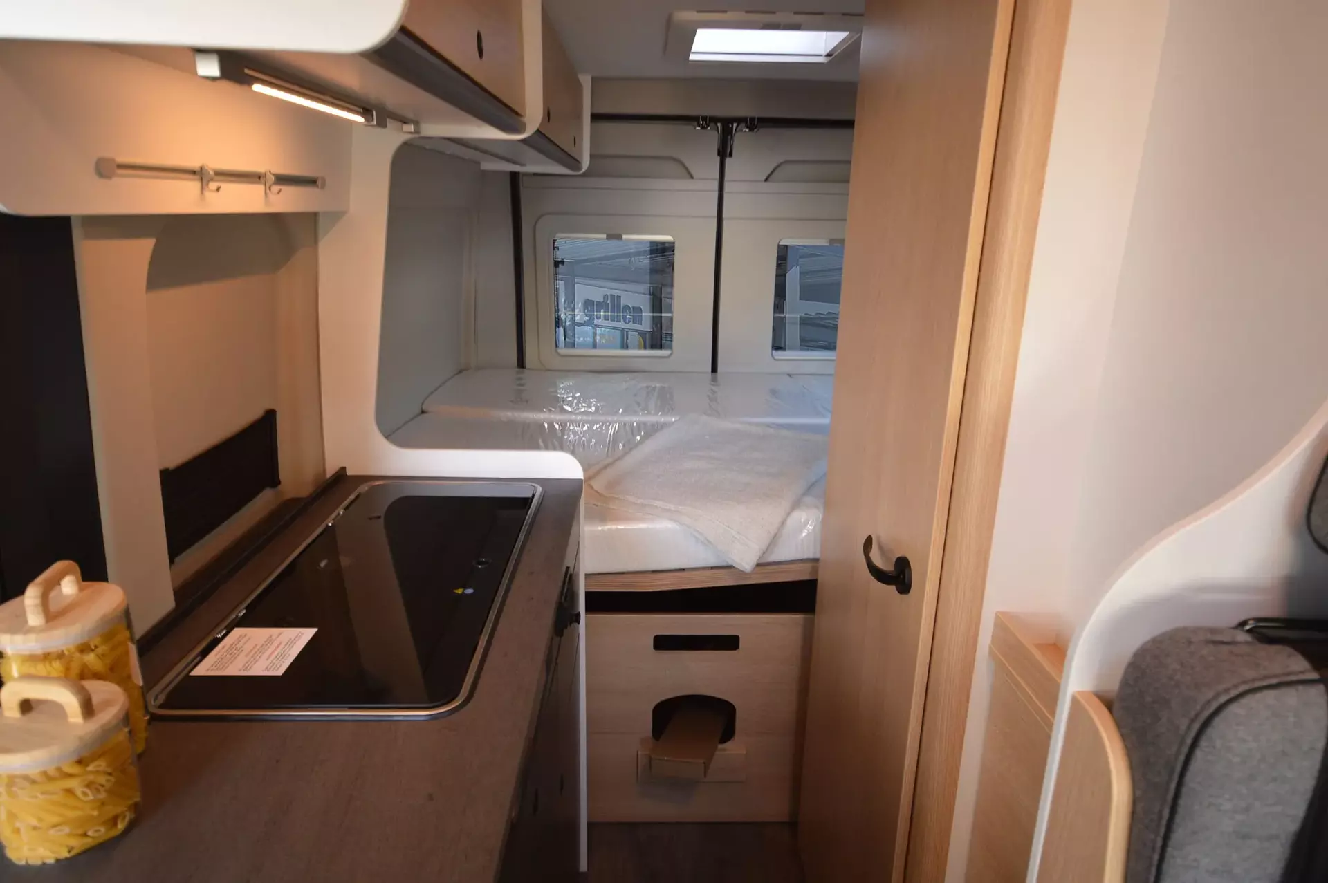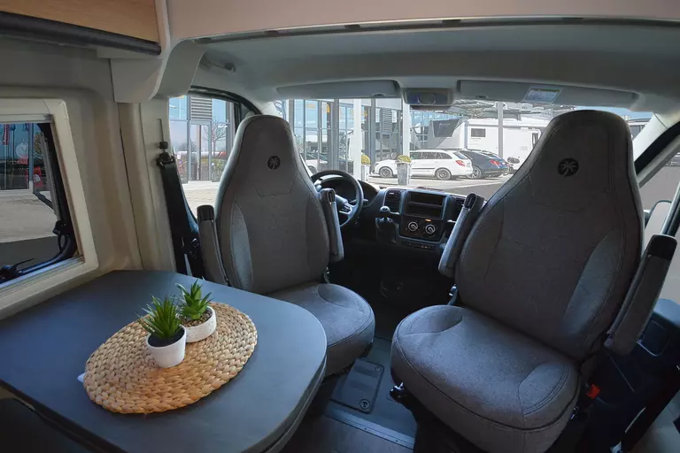 - Basic Paket (Panoramadachhaube 70 x 50 cm, Duschausstattung, Fenster im Bad, Kleiderstange in der Nasszelle, Breite Einstiegsstufe, Drehplatte für Tischerweiterung an der Sitzgruppe)