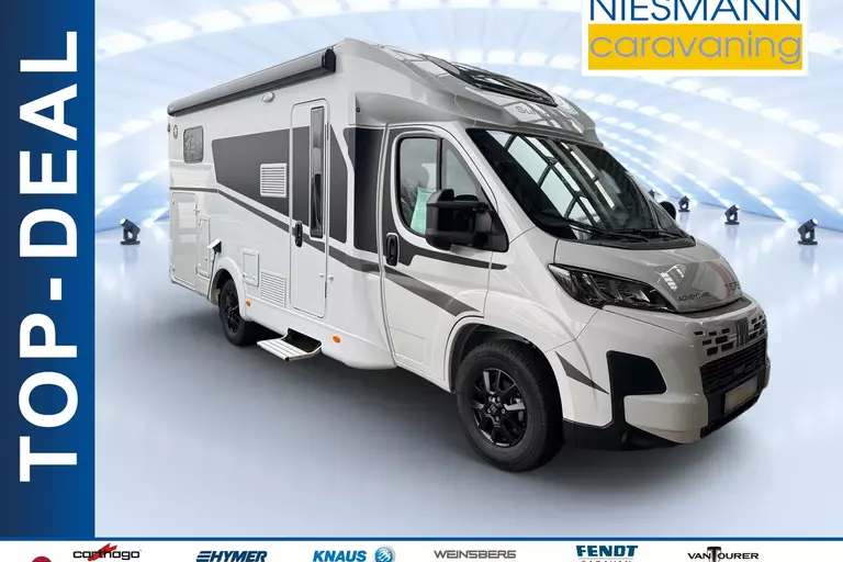 - Adventure Ausstattung 67S (Fiat Ducato 3.500 kg | 2.2 | 103 kW | 140 PS Euro 6 | 6-Gang-Schaltgetriebe, Fiat Weiß, Adventure Beklebung, Wohnwelt Adventure, Design Applikation Heck, Fenster in Fronthaube, Rahmenfenster, 2. Außenstauraumklappe (Größe modellabhängig), Großer Kühlschrank 156 l mit separatem Frosterfach 29 l, Bettenumbau Einzelbett zu Doppelbett, Paket One Black (Markise, Fahrradträger 3-fach), Bridge Light, Komfort Eingangstür mit Fenster, Fliegengittertür (einteilig), Panoramadachhaube 70 x 50 cm, Klarglasdachhaube 40 x 40 cm, Stoßfänger lackiert, Skid Plate Schwarz, Nebelscheinwerfer, Lenkrad & Schaltknauf in Lederausführung, Luftauslässe mit Applikationen Silber (Techno-Trim), 16" Alufelgen schwarz)