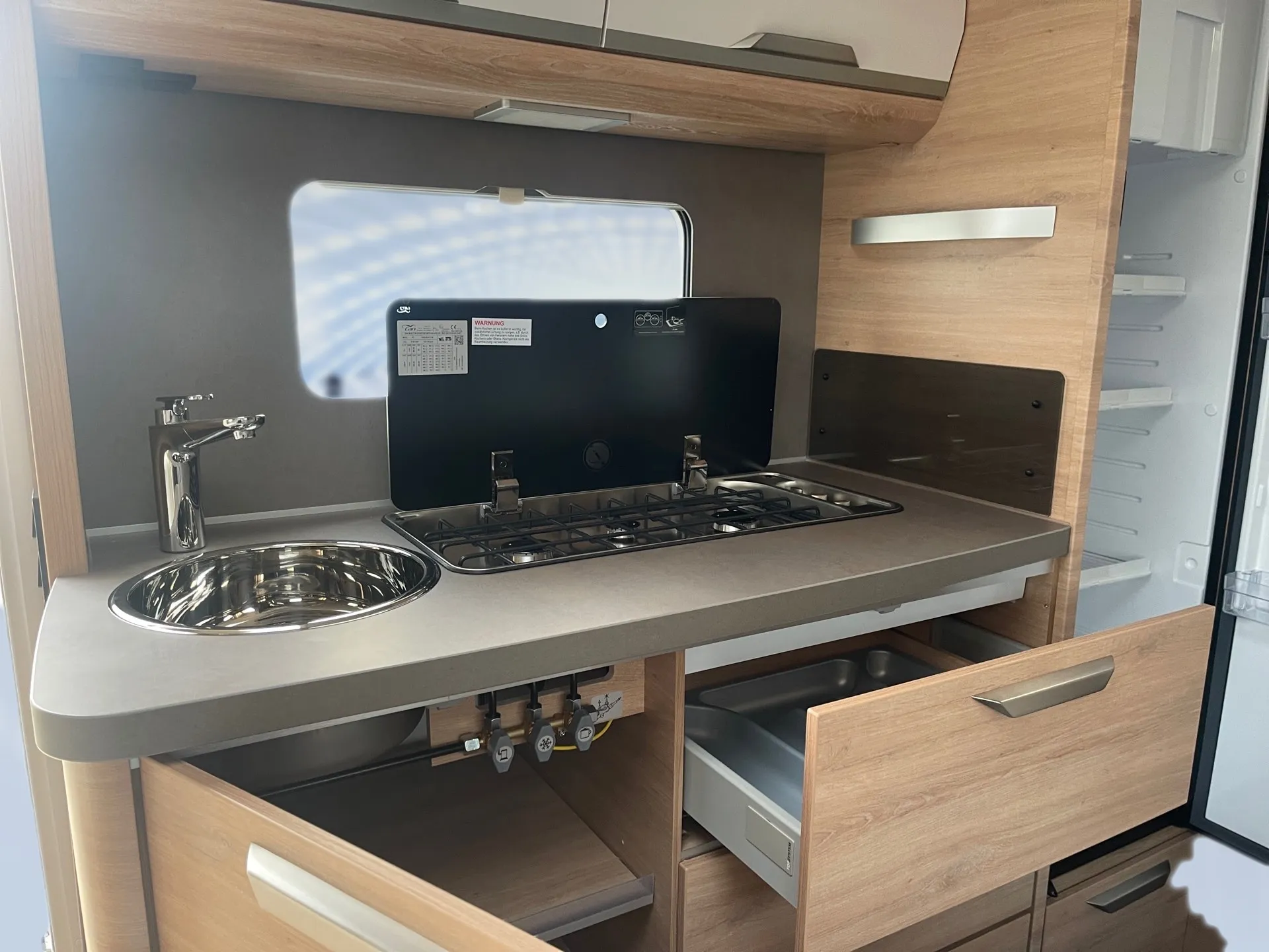 - 3-Flammen-Kocher mit elektrischer Zündung, Glasabdeckung und Spülbecken in Edelstahl