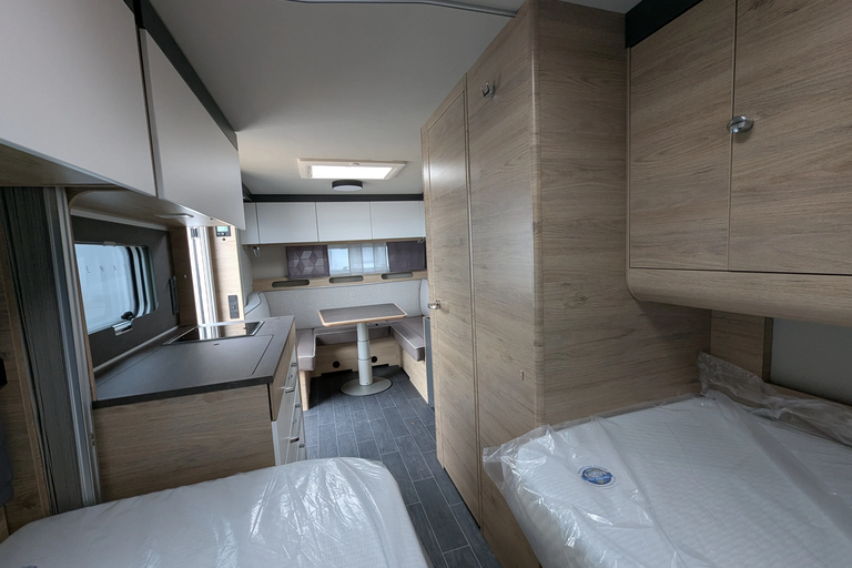 - Premium Interieur-Paket (TABBERT Komfort Schlafsystem mit flexiblem Tellerrost und WaterGEL-Matratze, Insektenschutztür, Deko-Paket Schlafen "PANTIGA": 4 Kissen und 2 Decken im Schlafbereich, Füllstandsanzeige für Frischwassertank)