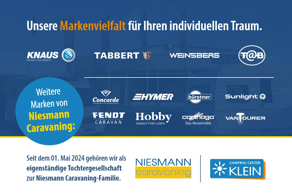 Seit mehr als 40 Jahren ist das Camping-Center Klein Ihr erster Ansprechpartner in Rheinland-Pfalz für Reisemobile und Wohnwagen der Knaus-Tabbert-Gruppe. Mit unserer Mutter, der NIESMANN Caravaning GmbH & Co. KG, stehen Ihnen über 100 Experten rund um alle Themen der mobilen Freizeit zur Verfügung.