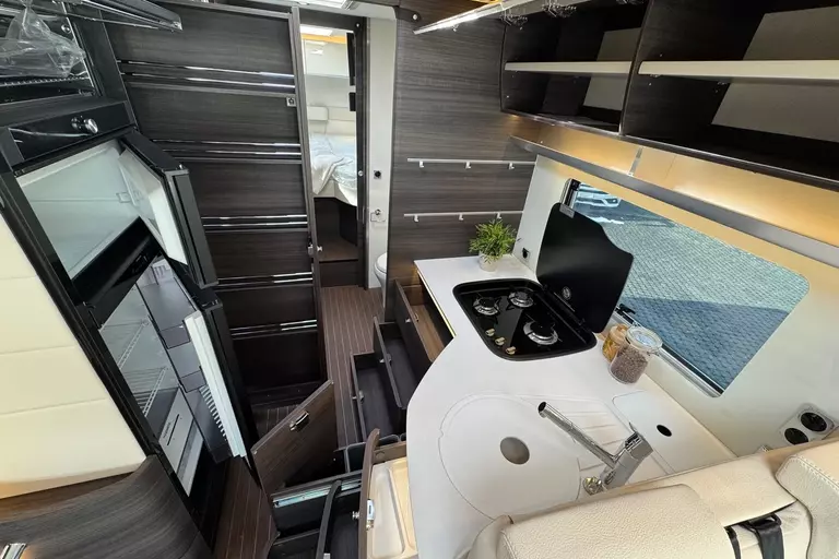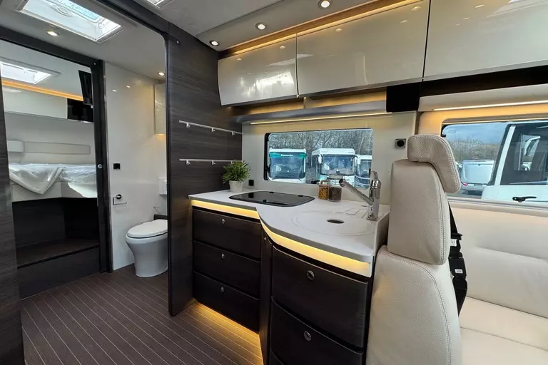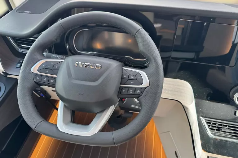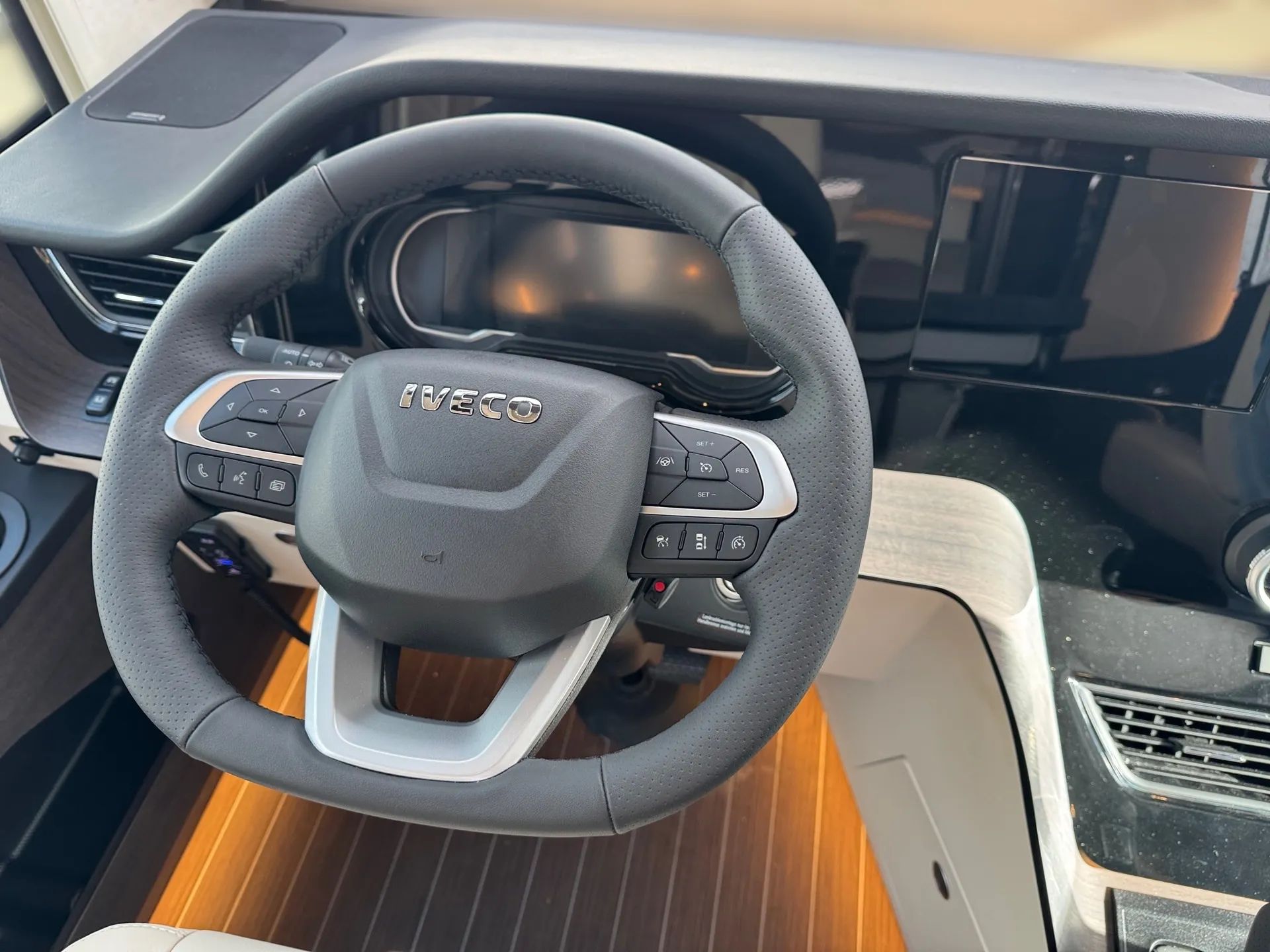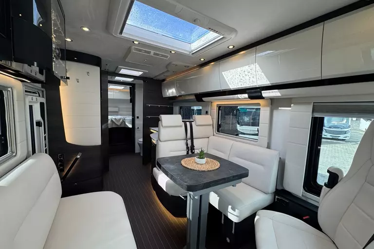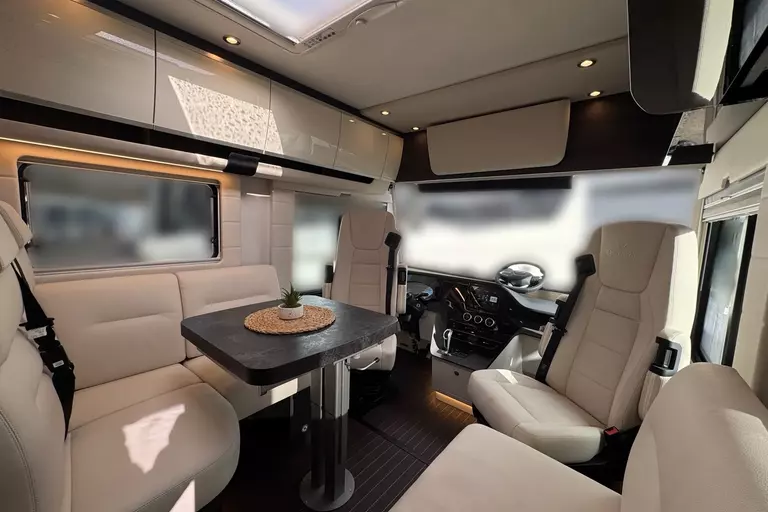 -Centurion Style-Paket: Möbelbau in Atlas Zeder mit Dachschrank-Möbelfronten in „high gloss“ Senosan Creme Weiß und Griffleisten in Edelstahl-Optik, Außendekor „Centurion Style“ im bruched Folien Design inklusive Schriftzug, Aufbaufenster mit Tönung in Privacy Black, Jalousien Wohnraum in Holzoptik, Objektboden Soft-Walk im Yacht-Style, Shadow Line LED Hauptscheinwerfer und im Stoßfänger integrierte LED-Nebelscheinwerfer, sowie statisches Kurvenlich. Tagfahr-Blinklicht mit LED