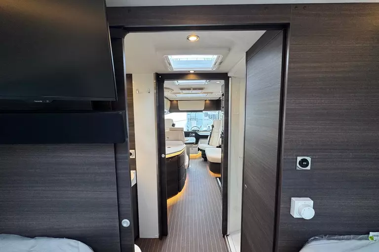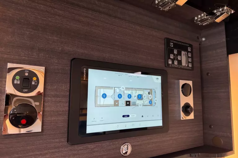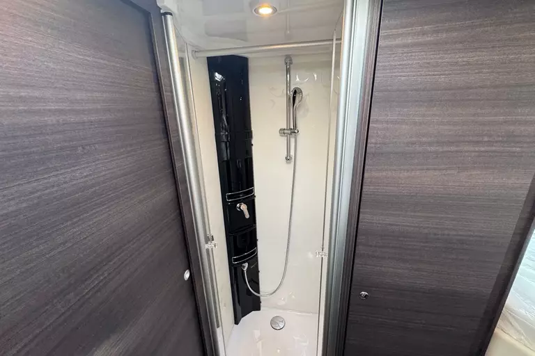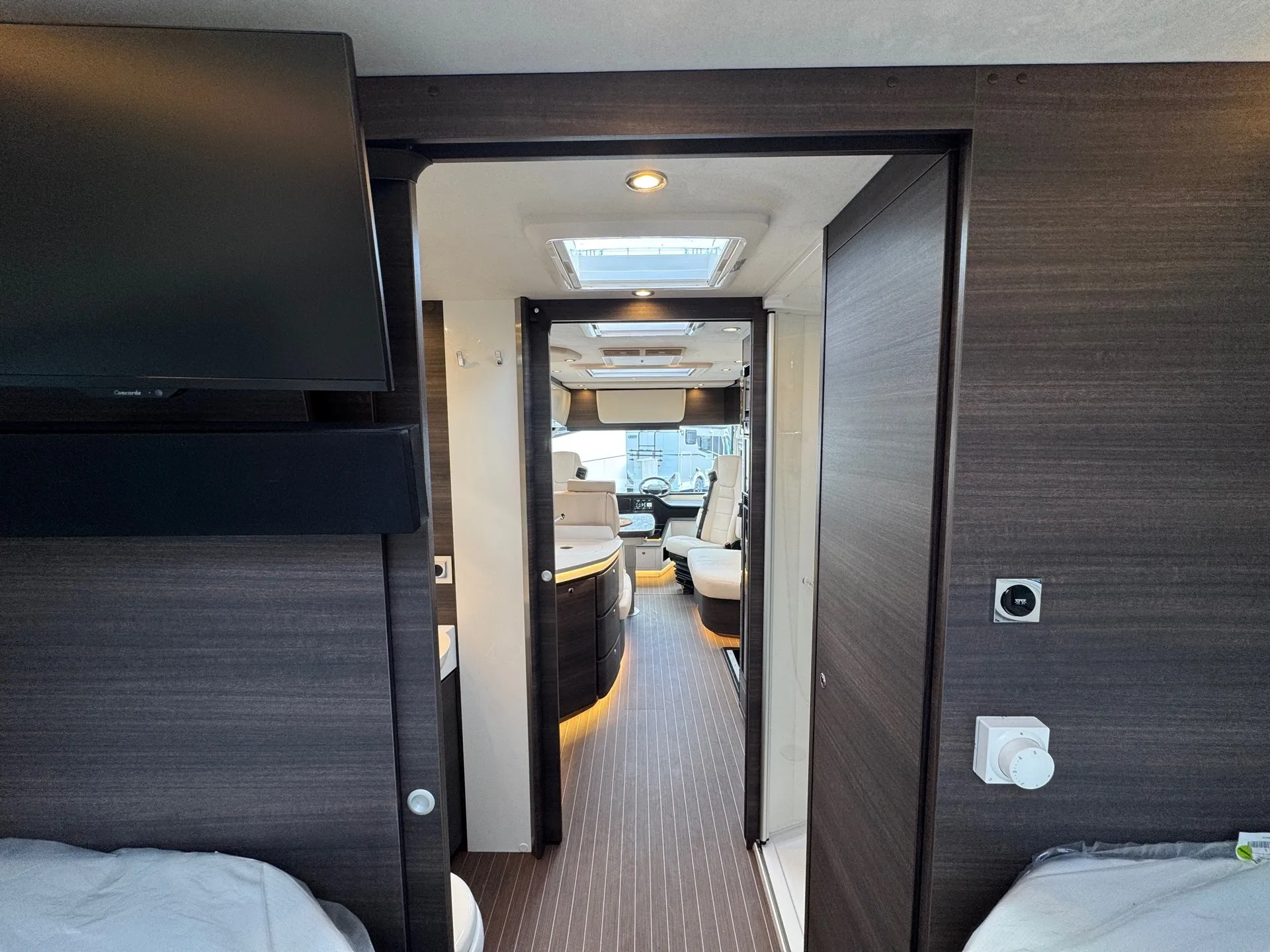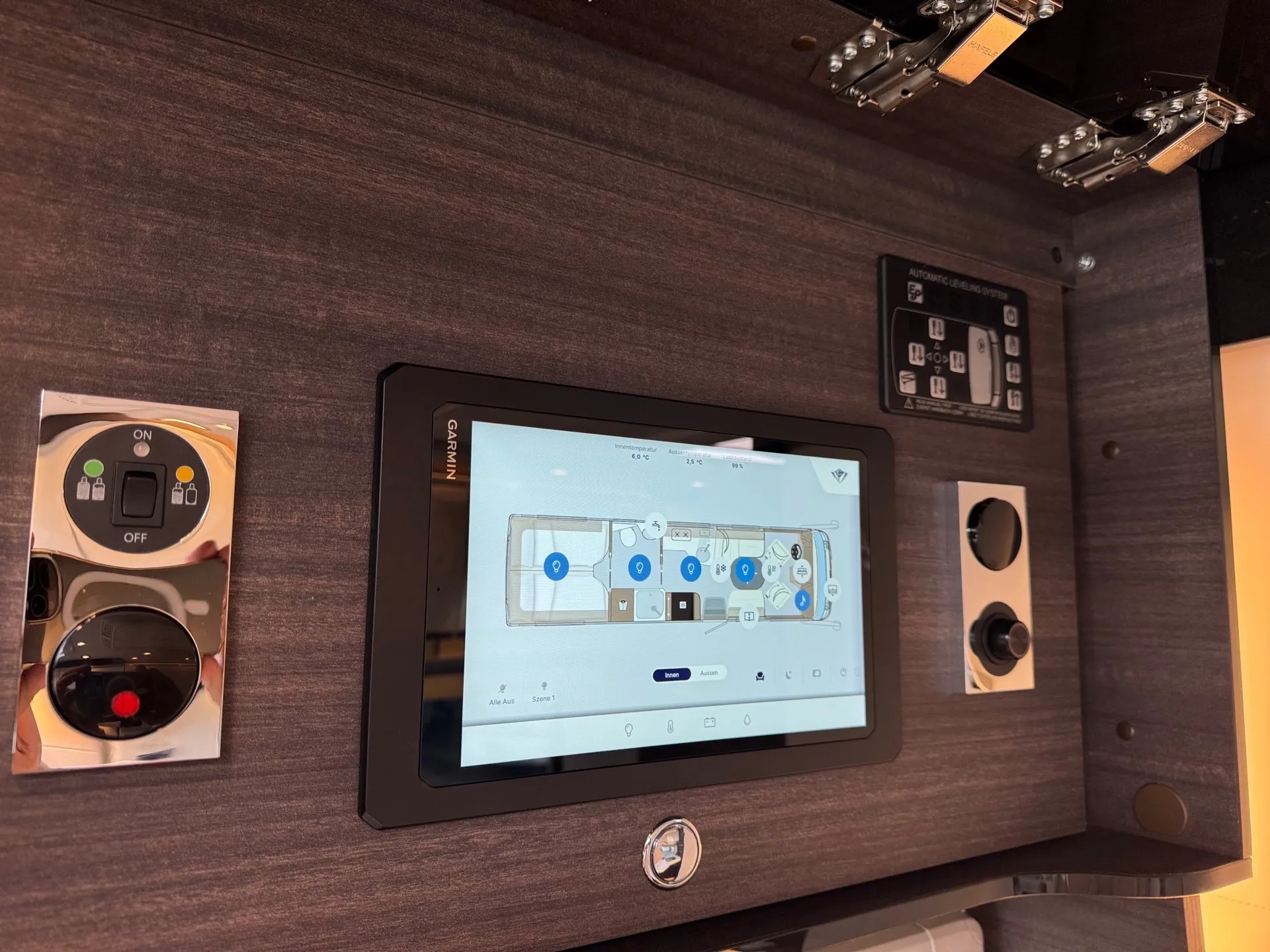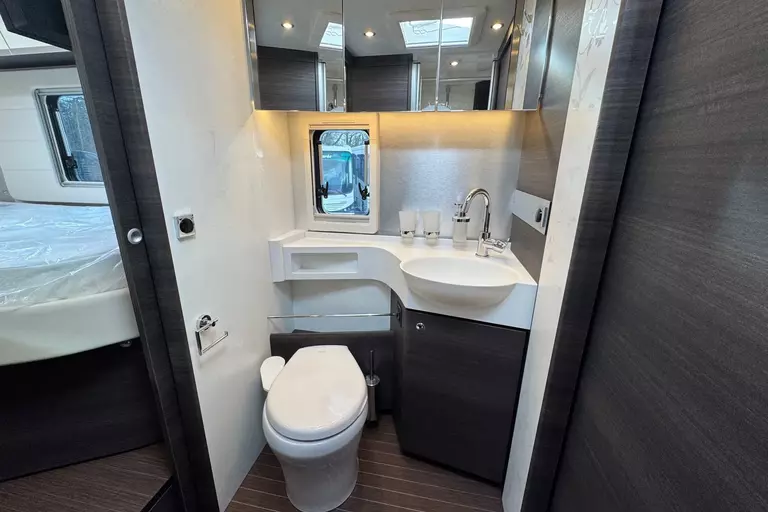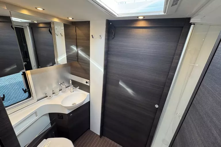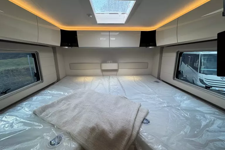 -Satelliten-TV-Anlage mit Full HD LED Smart TV 32“ im Oberschrank rechts, elektrisch absenkbar. Satelliten-TV-Anlage mit 85-cm-Spiegel, vollautomatische Ausrichtung, Mehrteilnehmer-Ausstattung durch TWIN-LNB, Anschluss für zweiten Receiver mit 12 V und Antennensteckdose im Schlafraum, Tonwiedergabe über Radioanlage möglich (Fahrzeuggesamthöhe plus ca. 120 mm)
