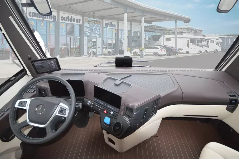-Drivers-Assistenz-Paket (Multimedia Cockpit mit 12" Primär- und 10" Sekundärdisplay, MB-Truck Navigationssystem, Verkehrszeichen-Assistent, Active-Drive Assist 2, Klimaautomatik mit Restwärmenutzung anstatt Klimaanlage, Radargesteuerter Abstandsregeltempomat)