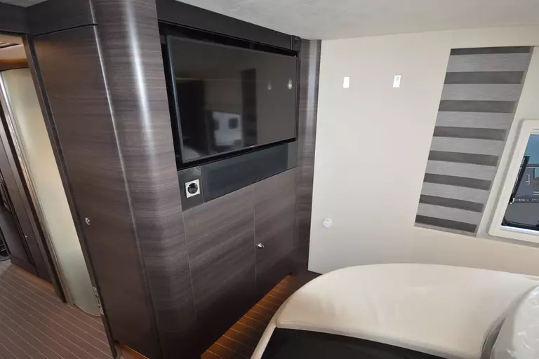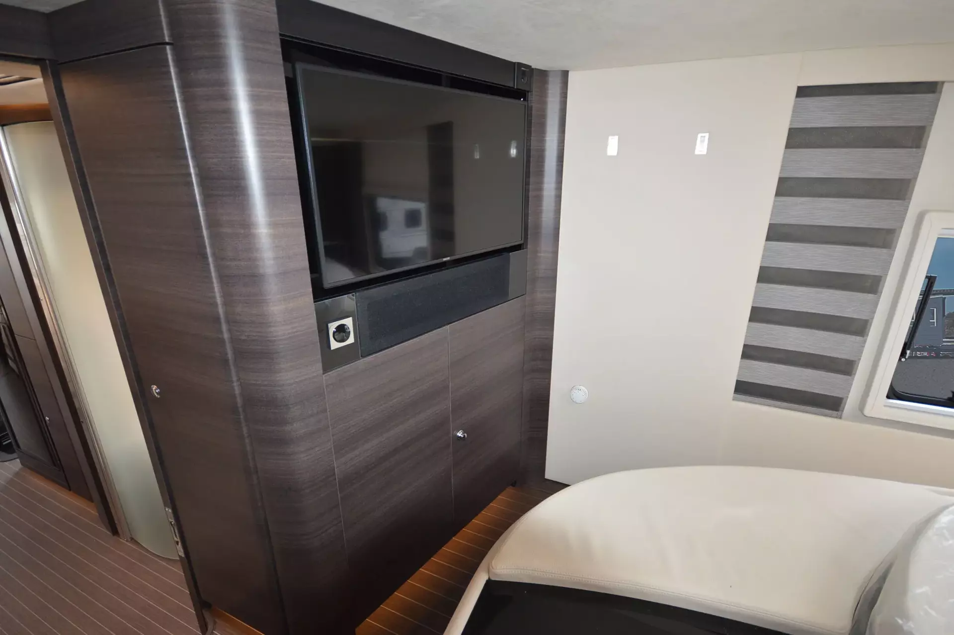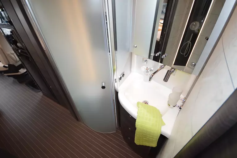 -Satelliten-TV-Anlage mit Full HD LED Smart TV 40" im Oberschrank rechts, elektrisch absenkbar (Satelliten-TV-Anlage mit 85-cm-Spiegel, vollautomatische Ausrichtung, Mehrteilnehmer-Ausstattung durch TWIN-LNB, Anschluss für zweiten Receiver mit 12 V und Antennensteckdose im Schlafraum, Tonwiedergabe über Radioanlage möglich (Fahrzeuggesamthöhe plus ca. 120 mm))