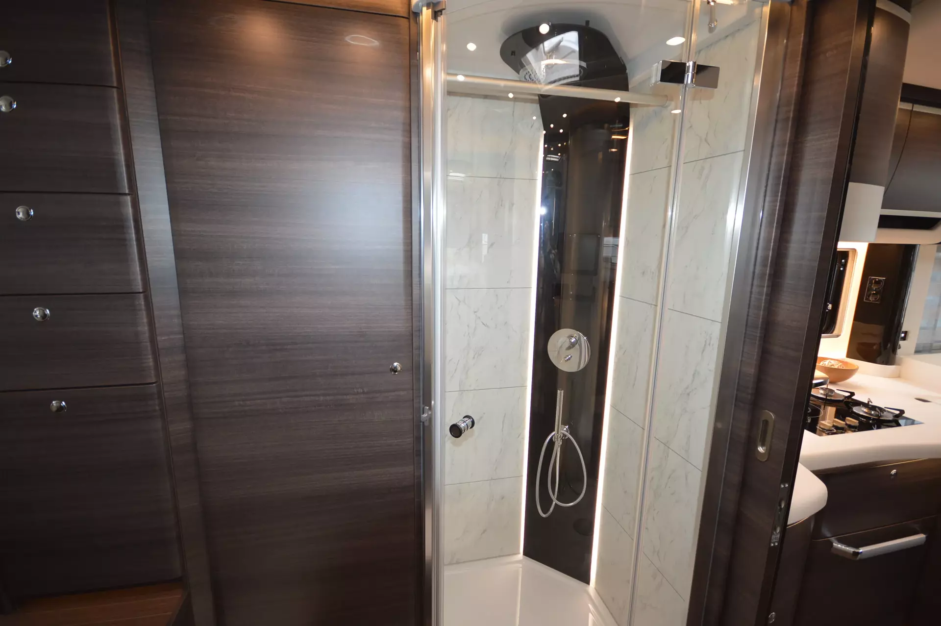 -Möbelbau in Atlas Zeder mit Dachschrank Möbelfronten in Atlas Zeder und Griffleisten in Edelstahl-Optik