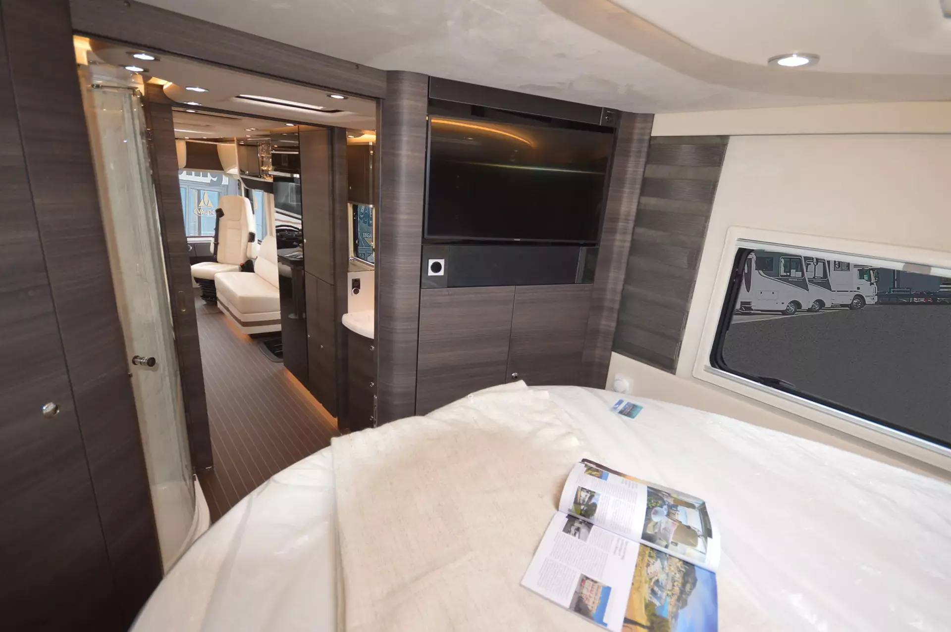 -Satelliten-TV-Anlage mit Full HD LED Smart TV 40" im Oberschrank rechts, elektrisch absenkbar (Satelliten-TV-Anlage mit 85-cm-Spiegel, vollautomatische Ausrichtung, Mehrteilnehmer-Ausstattung durch TWIN-LNB, Anschluss für zweiten Receiver mit 12 V und Antennensteckdose im Schlafraum, Tonwiedergabe über Radioanlage möglich (Fahrzeuggesamthöhe plus ca. 120 mm))