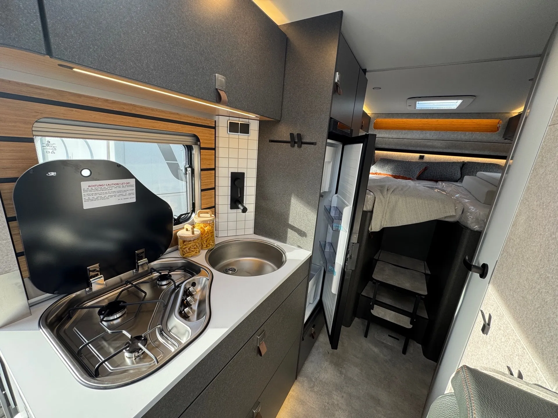 - GFK Dachbeschichtung (Die GFK-Dachbeschichtung ist nicht der Fahrzeugfarbe angepasst. Die Oberfläche der GFK-Beschichtung entspricht in seiner Güte nicht einem lackierten Außenblech.)