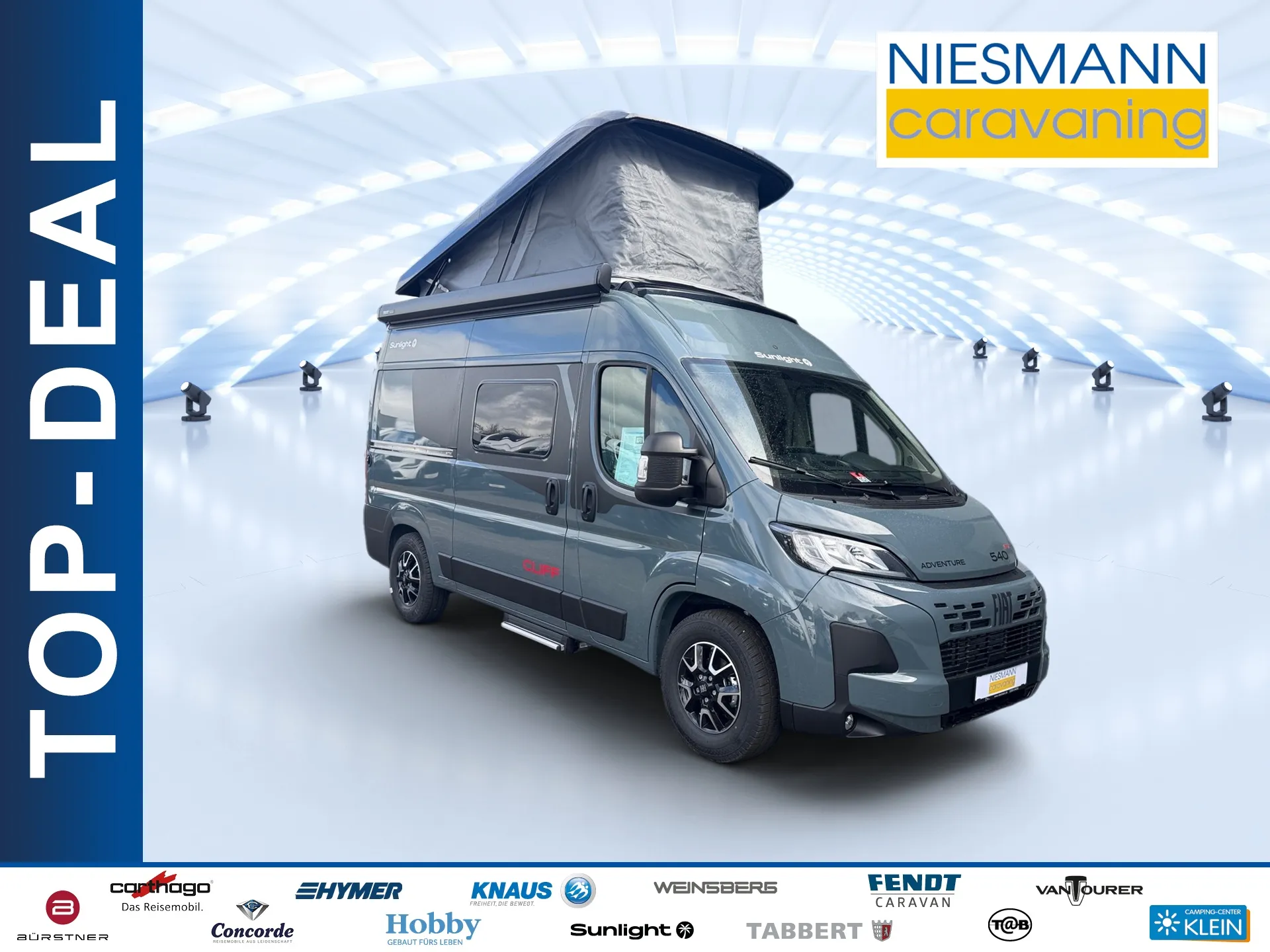 - CLIFF RT-Paket (Schlafdach inkl. RT-Beklebung) Aufstelldach vorne komplett zu öffnen inkl. Fliegengitter | LED-Leseleuchte | USB-Steckdose | hochwertiger Matratze | serienmäßiger Dachhaube Gesamthöhe Außen (bei geschlossenem Dach): 281 cm