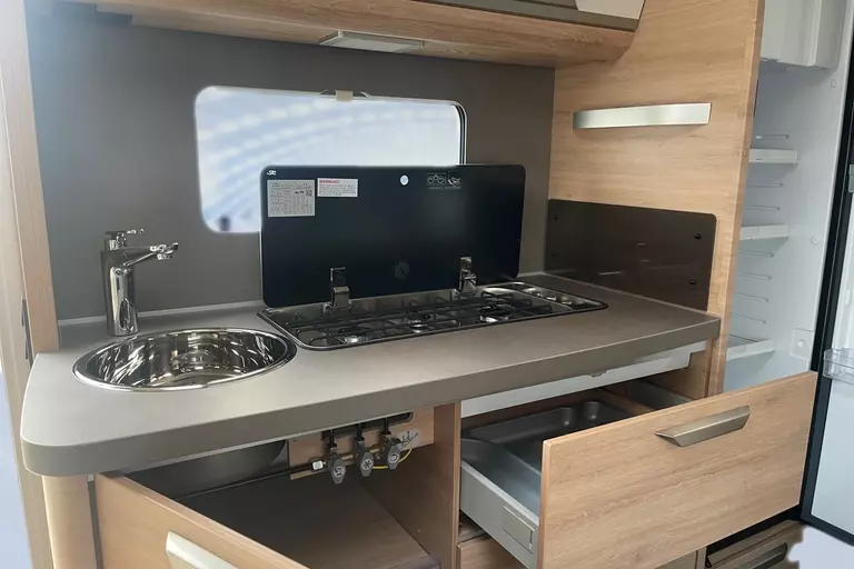 - 3-Flammen-Kocher mit elektrischer Zündung, Glasabdeckung und Spülbecken in Edelstahl