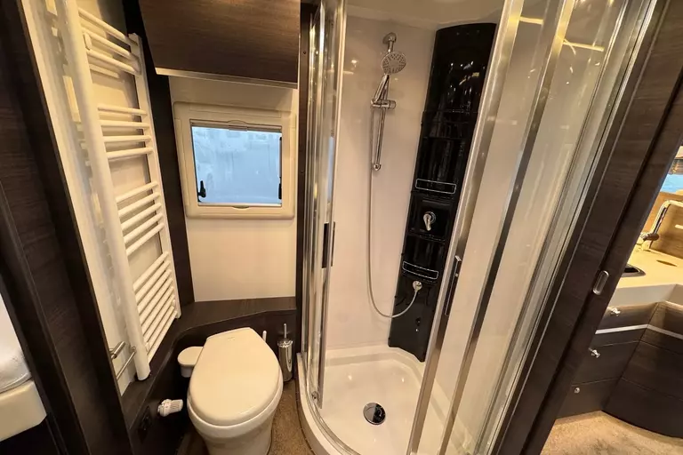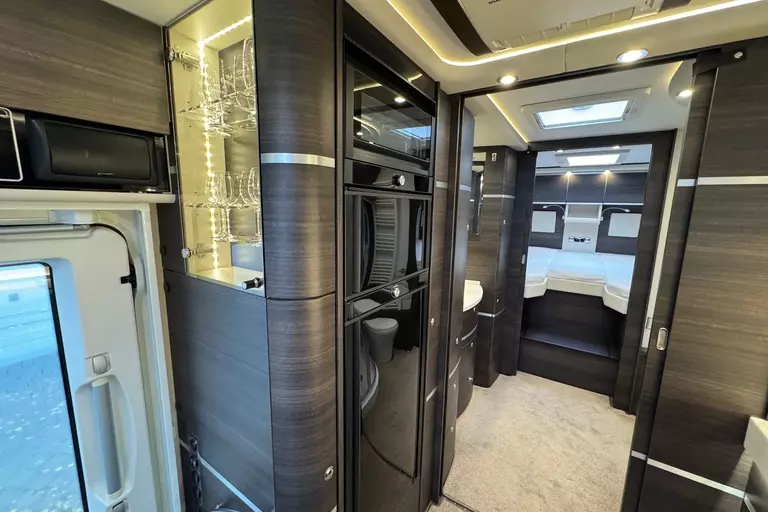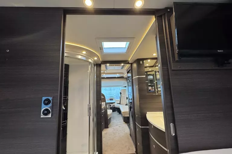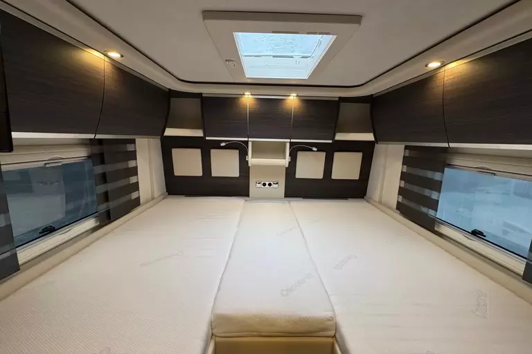 -Satelliten-TV-Anlage mit Full HD LED Smart TV 32 im Oberschrank rechts, elektrisch absenkbar (Satelliten-TV-Anlage mit 85-cm-Spiegel, vollautomatische Ausrichtung, Mehrteilnehmer-Ausstattung durch TWIN-LNB, Anschluss für zweiten Receiver mit 12 V und Antennensteckdose im Schlafraum, Tonwiedergabe über Radioanlage möglich (Fahrzeuggesamthöhe plus ca. 120 mm))