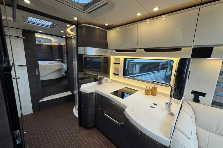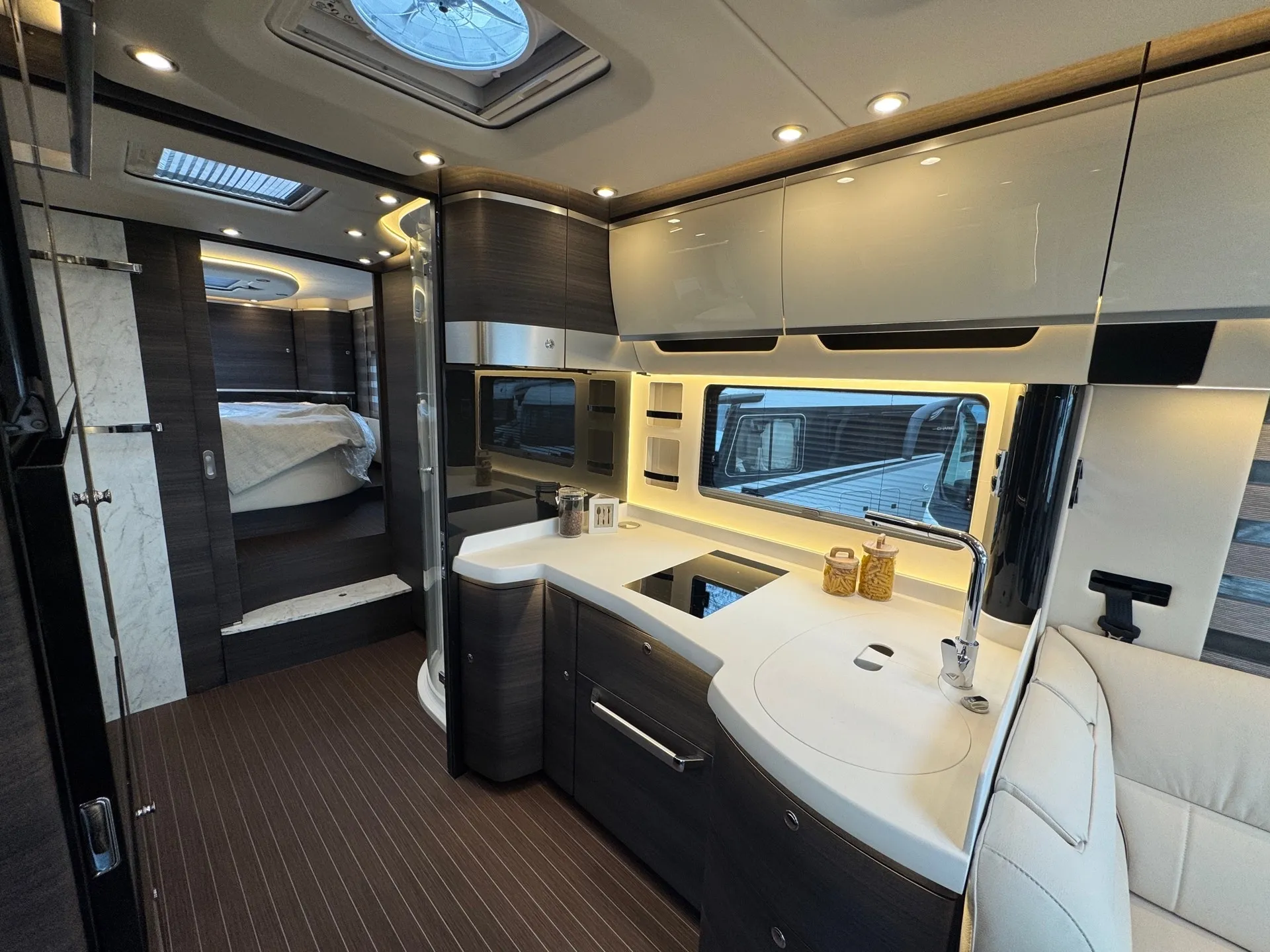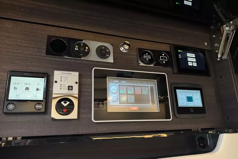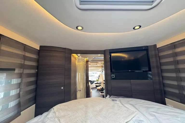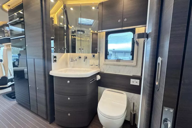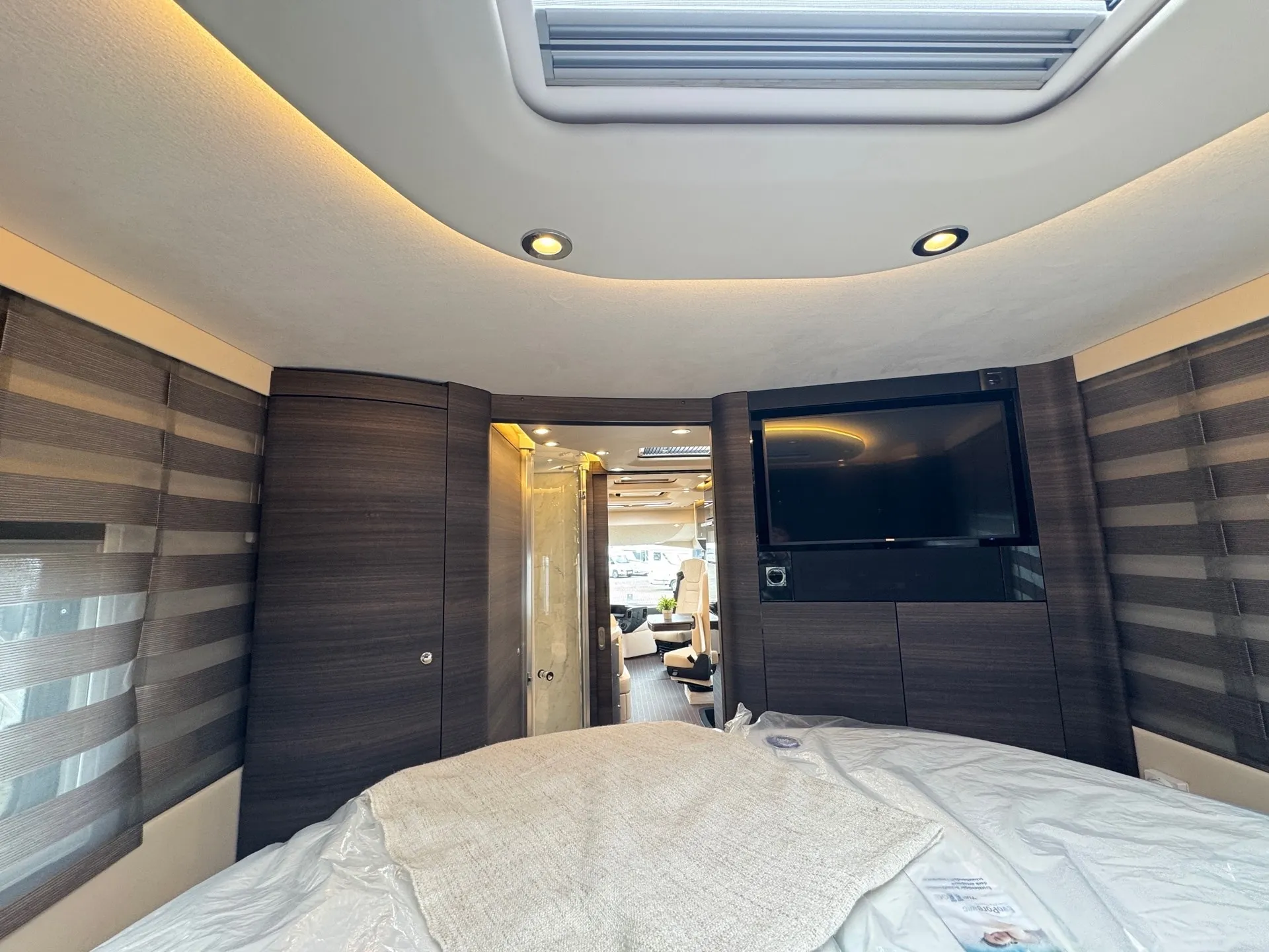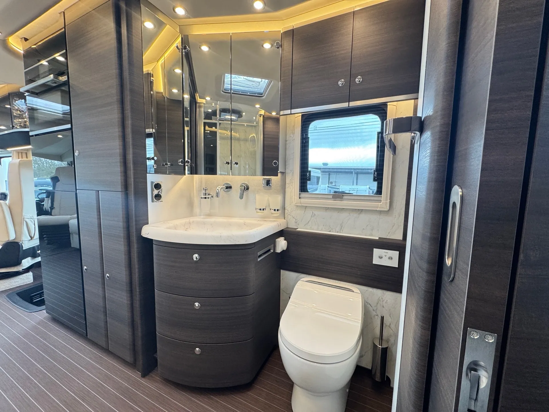 -Satelliten-TV-Anlage mit Full HD LED Smart TV 40" im Oberschrank rechts, elektrisch absenkbar (Satelliten-TV-Anlage mit 85-cm-Spiegel, vollautomatische Ausrichtung, Mehrteilnehmer-Ausstattung durch TWIN-LNB, Anschluss für zweiten Receiver mit 12 V und Antennensteckdose im Schlafraum, Tonwiedergabe über Radioanlage möglich (Fahrzeuggesamthöhe plus ca. 120 mm))